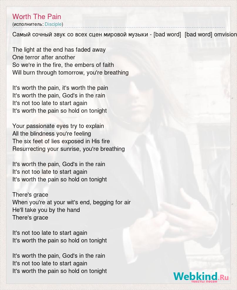 Самый сочный звук со всех сцен мировой музыки - [bad word] [bad word] omvision The light at the end has faded away One terror after another So we're in the fire, the embers of faith Will burn through tomorrow, you're breathing It's worth the pain, it's worth the pain It's worth the pain, God's in the rain It's not too late to start again It's worth the pain so hold on tonight Your passionate eyes try to explain All the blindness you're feeling The six feet of lies exposed in His fire Resurrecting your sunrise, you're breathing It's worth the pain, God's in the rain It's not too late to start again It's worth the pain so hold on tonight There's grace When you're at your wit's end, begging for air He'll take you by the hand There's grace It's not too late to start again It's worth the pain so hold on tonight It's worth the pain, God's in the rain It's not too late to start again It's worth the pain so hold on tonight