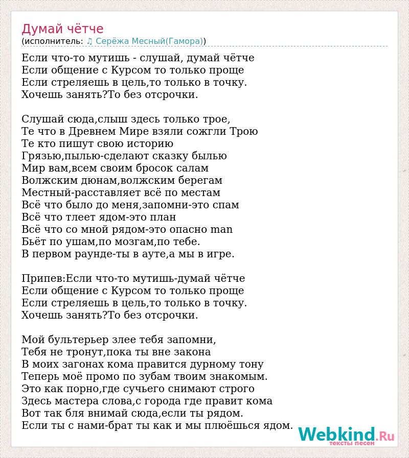 Если что-то мутишь - слушай, думай чётче Если общение с Курсом то только проще Если стреляешь в цель,то только в точку. Хочешь занять?То без отсрочки. Слушай сюда,слыш здесь только трое, Те что в Древнем Мире взяли сожгли Трою Те кто пишут свою историю Грязью,пылью-сделают сказку былью Мир вам,всем своим бросок салам Волжским дюнам,волжским берегам Местный-расставляет всё по местам Всё что было до меня,запомни-это спам Всё что тлеет ядом-это план Всё что со мной рядом-это опасно man Бьёт по ушам,по мозгам,по тебе. В первом раунде-ты в ауте,а мы в игре. Припев:Если что-то мутишь-думай чётче Если общение с Курсом то только проще Если стреляешь в цель,то только в точку. Хочешь занять?То без отсрочки. Мой бультерьер злее тебя запомни, Тебя не тронут,пока ты вне закона В моих загонах кома правится дурному тону Теперь моё промо по зубам твоим знакомым. Это как порно,где сучьего снимают строго Здесь мастера слова,с города где правит кома Вот так бля внимай сюда,если ты рядом. Если ты с нами-брат ты как и мы плюёшься ядом.
