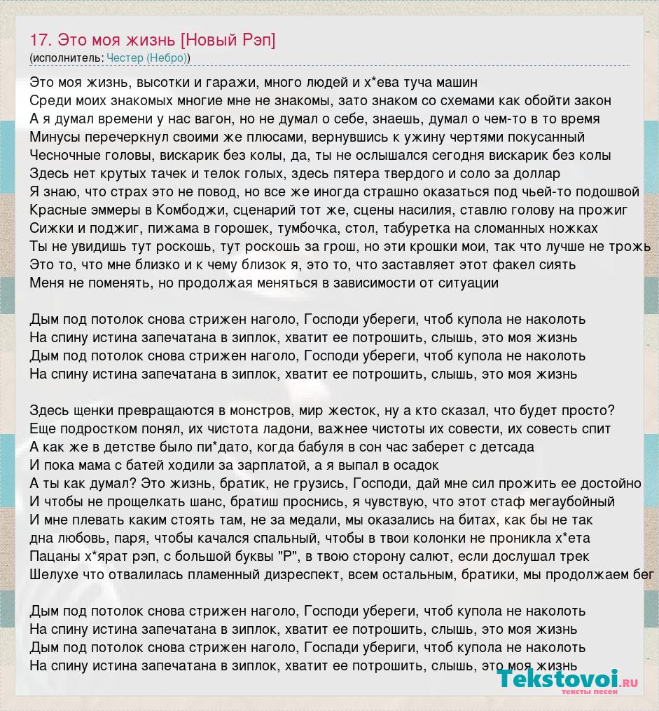 Это моя жизнь, высотки и гаражи, много людей и х*ева туча машин Среди моих знакомых многие мне не знакомы, зато знаком со схемами как обойти закон А я думал времени у нас вагон, но не думал о себе, знаешь, думал о чем-то в то время Минусы перечеркнул своими же плюсами, вернувшись к ужину чертями покусанный Чесночные головы, вискарик без колы, да, ты не ослышался сегодня вискарик без колы Здесь нет крутых тачек и телок голых, здесь пятера твердого и соло за доллар Я знаю, что страх это не повод, но все же иногда страшно оказаться под чьей-то подошвой Красные эммеры в Комбоджи, сценарий тот же, сцены насилия, ставлю голову на прожиг Сижки и поджиг, пижама в горошек, тумбочка, стол, табуретка на сломанных ножках Ты не увидишь тут роскошь, тут роскошь за грош, но эти крошки мои, так что лучше не трожь Это то, что мне близко и к чему близок я, это то, что заставляет этот факел сиять Меня не поменять, но продолжая меняться в зависимости от ситуации Дым под потолок снова стрижен наголо, Господи убереги, чтоб купола не наколоть На спину истина запечатана в зиплок, хватит ее потрошить, слышь, это моя жизнь Дым под потолок снова стрижен наголо, Господи убереги, чтоб купола не наколоть На спину истина запечатана в зиплок, хватит ее потрошить, слышь, это моя жизнь Здесь щенки превращаются в монстров, мир жесток, ну а кто сказал, что будет просто? Еще подростком понял, их чистота ладони, важнее чистоты их совести, их совесть спит А как же в детстве было пи*дато, когда бабуля в сон час заберет с детсада И пока мама с батей ходили за зарплатой, а я выпал в осадок А ты как думал? Это жизнь, братик, не грузись, Господи, дай мне сил прожить ее достойно И чтобы не прощелкать шанс, братиш проснись, я чувствую, что этот стаф мегаубойный И мне плевать каким стоять там, не за медали, мы оказались на битах, как бы не так дна любовь, паря, чтобы качался спальный, чтобы в твои колонки не проникла х*ета Пацаны х*ярат рэп, с большой буквы "Р", в твою сторону салют, если дослушал трек Шелухе что отвалилась пламенный дизреспект, всем остальным, братики, мы продолжаем бег Дым под потолок снова стрижен наголо, Господи убереги, чтоб купола не наколоть На спину истина запечатана в зиплок, хватит ее потрошить, слышь, это моя жизнь Дым под потолок снова стрижен наголо, Госпади убериги, чтоб купола не наколоть На спину истина запечатана в зиплок, хватит ее потрошить, слышь, это моя жизнь
