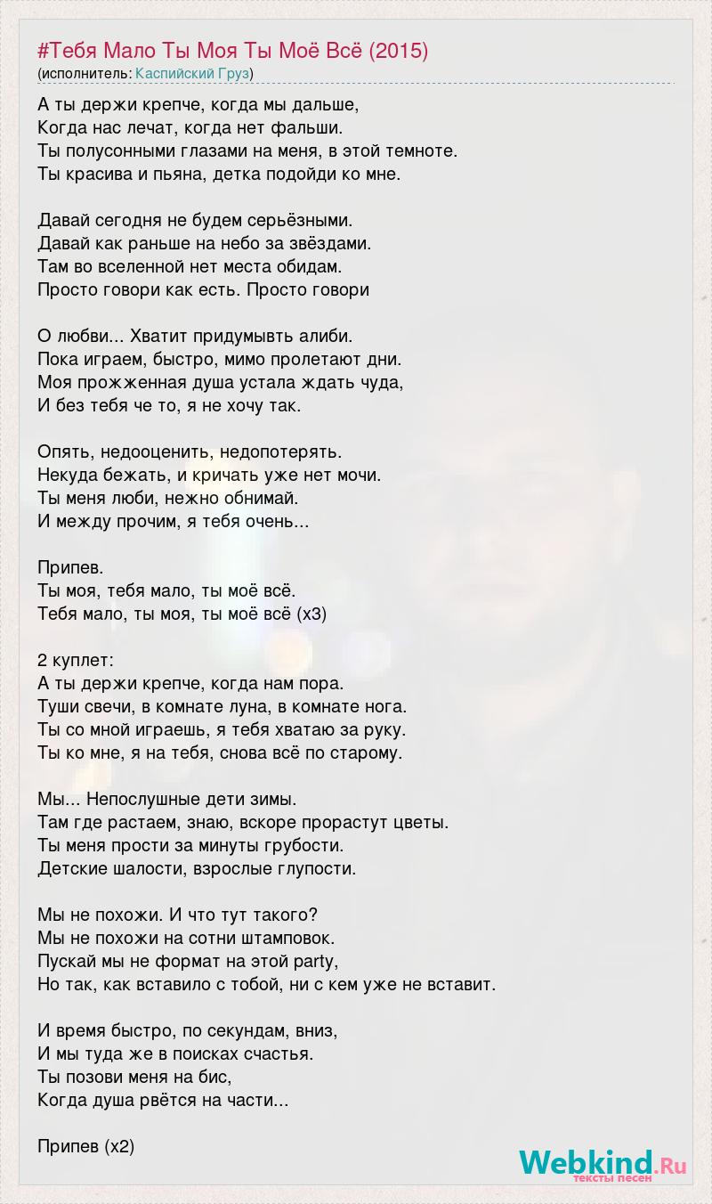 А ты держи крепче, когда мы дальше, Когда нас лечат, когда нет фальши. Ты полусонными глазами на меня, в этой темноте. Ты красива и пьяна, детка подойди ко мне. Давай сегодня не будем серьёзными. Давай как раньше на небо за звёздами. Там во вселенной нет места обидам. Просто говори как есть. Просто говори О любви... Хватит придумывть алиби. Пока играем, быстро, мимо пролетают дни. Моя прожженная душа устала ждать чуда, И без тебя че то, я не хочу так. Опять, недооценить, недопотерять. Некуда бежать, и кричать уже нет мочи. Ты меня люби, нежно обнимай. И между прочим, я тебя очень... Припев. Ты моя, тебя мало, ты моё всё. Тебя мало, ты моя, ты моё всё (х3) 2 куплет: А ты держи крепче, когда нам пора. Туши свечи, в комнате луна, в комнате нога. Ты со мной играешь, я тебя хватаю за руку. Ты ко мне, я на тебя, снова всё по старому. Мы... Непослушные дети зимы. Там где растаем, знаю, вскоре прорастут цветы. Ты меня прости за минуты грубости. Детские шалости, взрослые глупости. Мы не похожи. И что тут такого? Мы не похожи на сотни штамповок. Пускай мы не формат на этой party, Но так, как вставило с тобой, ни с кем уже не вставит. И время быстро, по секундам, вниз, И мы туда же в поисках счастья. Ты позови меня на бис, Когда душа рвётся на части... Припев (х2)