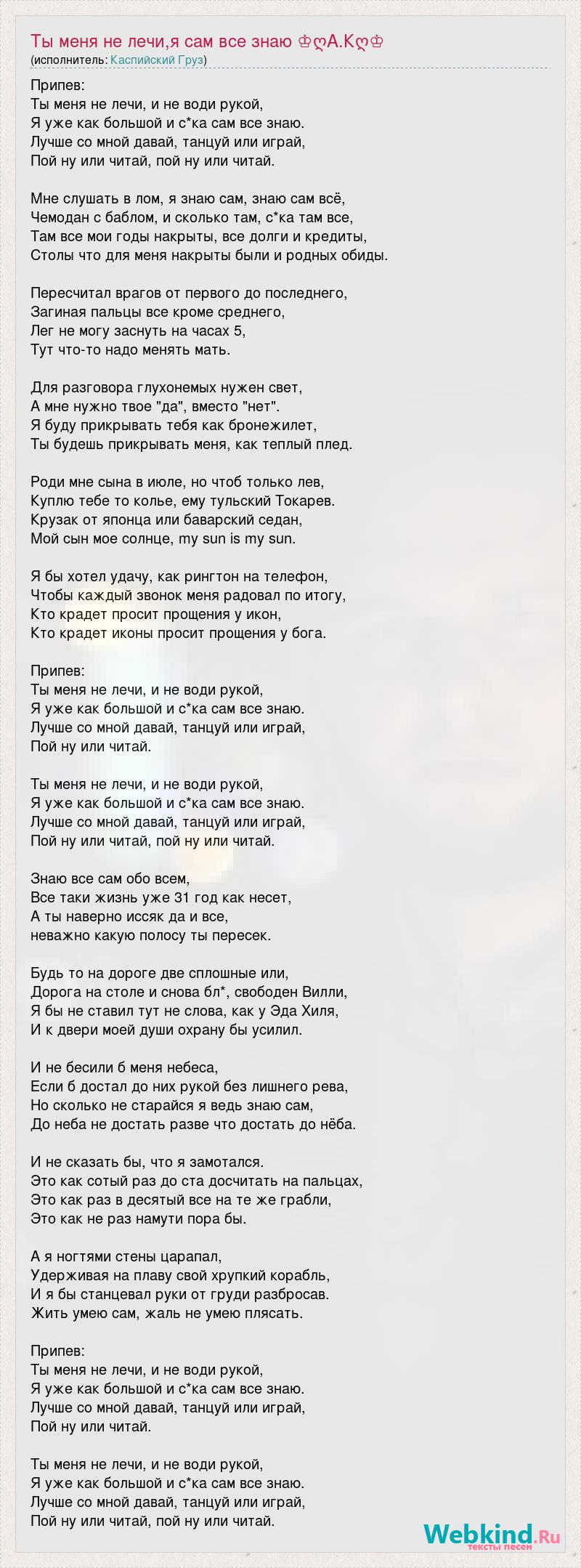 Припев: Ты меня не лечи, и не води рукой, Я уже как большой и с*ка сам все знаю. Лучше со мной давай, танцуй или играй, Пой ну или читай, пой ну или читай. Мне слушать в лом, я знаю сам, знаю сам всё, Чемодан с баблом, и сколько там, с*ка там все, Там все мои годы накрыты, все долги и кредиты, Столы что для меня накрыты были и родных обиды. Пересчитал врагов от первого до последнего, Загиная пальцы все кроме среднего, Лег не могу заснуть на часах 5, Тут что-то надо менять мать. Для разговора глухонемых нужен свет, А мне нужно твое "да", вместо "нет". Я буду прикрывать тебя как бронежилет, Ты будешь прикрывать меня, как теплый плед. Роди мне сына в июле, но чтоб только лев, Куплю тебе то колье, ему тульский Токарев. Крузак от японца или баварский седан, Мой сын мое солнце, my sun is my sun. Я бы хотел удачу, как рингтон на телефон, Чтобы каждый звонок меня радовал по итогу, Кто крадет просит прощения у икон, Кто крадет иконы просит прощения у бога. Припев: Ты меня не лечи, и не води рукой, Я уже как большой и с*ка сам все знаю. Лучше со мной давай, танцуй или играй, Пой ну или читай. Ты меня не лечи, и не води рукой, Я уже как большой и с*ка сам все знаю. Лучше со мной давай, танцуй или играй, Пой ну или читай, пой ну или читай. Знаю все сам обо всем, Все таки жизнь уже 31 год как несет, А ты наверно иссяк да и все, неважно какую полосу ты пересек. Будь то на дороге две сплошные или, Дорога на столе и снова бл*, свободен Вилли, Я бы не ставил тут не слова, как у Эда Хиля, И к двери моей души охрану бы усилил. И не бесили б меня небеса, Если б достал до них рукой без лишнего рева, Но сколько не старайся я ведь знаю сам, До неба не достать разве что достать до нёба. И не сказать бы, что я замотался. Это как сотый раз до ста досчитать на пальцах, Это как раз в десятый все на те же грабли, Это как не раз намути пора бы. А я ногтями стены царапал, Удерживая на плаву свой хрупкий корабль, И я бы станцевал руки от груди разбросав. Жить умею сам, жаль не умею плясать. Припев: Ты меня не лечи, и не води рукой, Я уже как большой и с*ка сам все знаю. Лучше со мной давай, танцуй или играй, Пой ну или читай. Ты меня не лечи, и не води рукой, Я уже как большой и с*ка сам все знаю. Лучше со мной давай, танцуй или играй, Пой ну или читай, пой ну или читай.