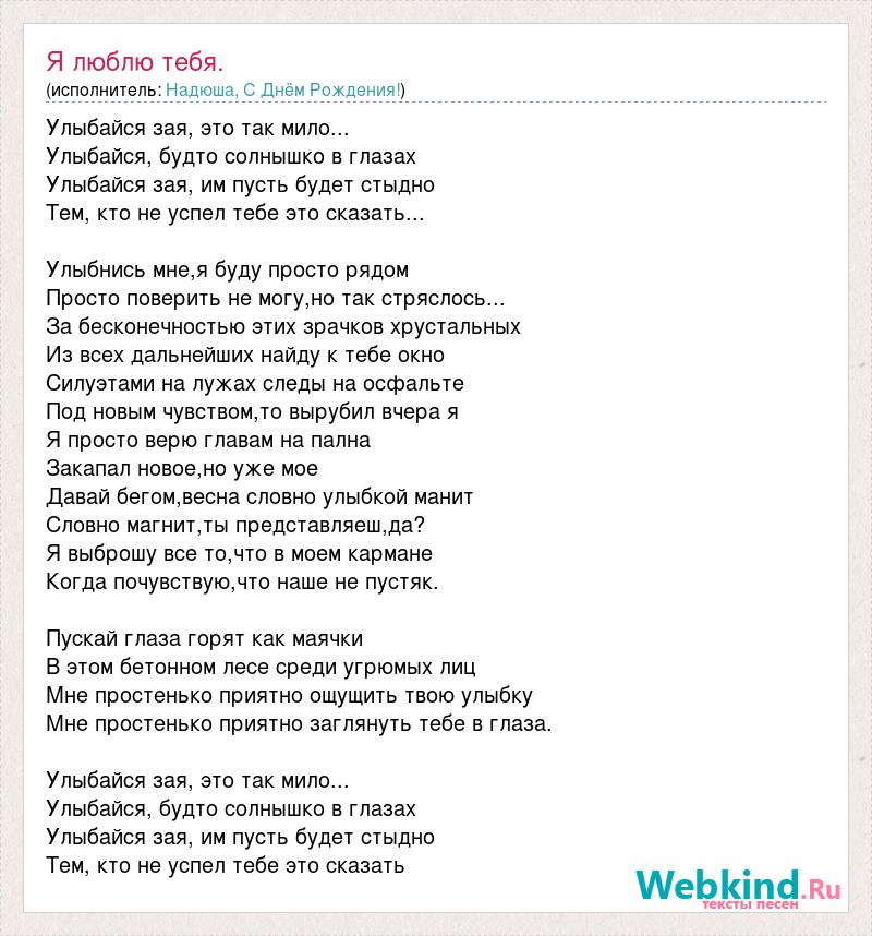 Улыбайся зая, это так мило... Улыбайся, будто солнышко в глазах Улыбайся зая, им пусть будет стыдно Тем, кто не успел тебе это сказать... Улыбнись мне,я буду просто рядом Просто поверить не могу,но так стряслось... За бесконечностью этих зрачков хрустальных Из всех дальнейших найду к тебе окно Силуэтами на лужах следы на осфальте Под новым чувством,то вырубил вчера я Я просто верю главам на пална Закапал новое,но уже мое Давай бегом,весна словно улыбкой манит Словно магнит,ты представляеш,да? Я выброшу все то,что в моем кармане Когда почувствую,что наше не пустяк. Пускай глаза горят как маячки В этом бетонном лесе среди угрюмых лиц Мне простенько приятно ощущить твою улыбку Мне простенько приятно заглянуть тебе в глаза. Улыбайся зая, это так мило... Улыбайся, будто солнышко в глазах Улыбайся зая, им пусть будет стыдно Тем, кто не успел тебе это сказать