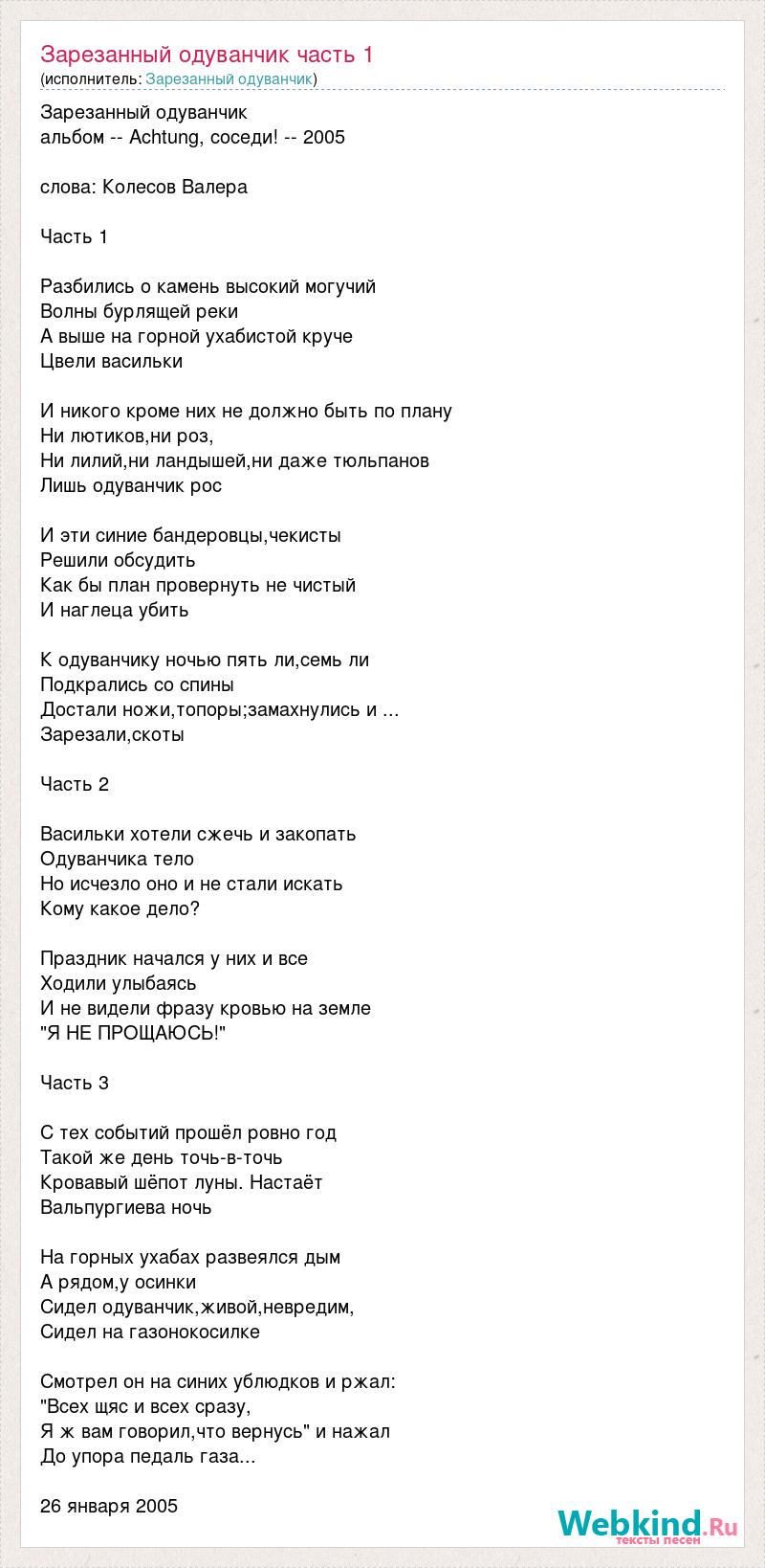 Зарезанный одуванчик альбом -- Achtung, соседи! -- 2005 слова: Колесов Валера Часть 1 Разбились о камень высокий могучий Волны бурлящей реки А выше на горной ухабистой круче Цвели васильки И никого кроме них не должно быть по плану Ни лютиков,ни роз, Ни лилий,ни ландышей,ни даже тюльпанов Лишь одуванчик рос И эти синие бандеровцы,чекисты Решили обсудить Как бы план провернуть не чистый И наглеца убить К одуванчику ночью пять ли,семь ли Подкрались со спины Достали ножи,топоры;замахнулись и ... Зарезали,скоты Часть 2 Васильки хотели сжечь и закопать Одуванчика тело Но исчезло оно и не стали искать Кому какое дело? Праздник начался у них и все Ходили улыбаясь И не видели фразу кровью на земле "Я НЕ ПРОЩАЮСЬ!" Часть 3 С тех событий прошёл ровно год Такой же день точь-в-точь Кровавый шёпот луны. Настаёт Вальпургиева ночь На горных ухабах развеялся дым А рядом,у осинки Сидел одуванчик,живой,невредим, Сидел на газонокосилке Смотрел он на синих ублюдков и ржал: "Всех щяс и всех сразу, Я ж вам говорил,что вернусь" и нажал До упора педаль газа... 26 января 2005