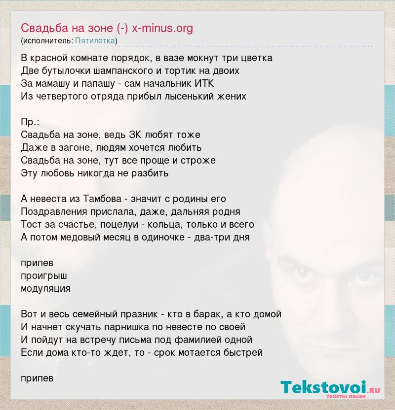 В красной комнате порядок, в вазе мокнут три цветка Две бутылочки шампанского и тортик на двоих За мамашу и папашу - сам начальник ИТК Из четвертого отряда прибыл лысенький жених Пр.: Свадьба на зоне, ведь ЗК любят тоже Даже в загоне, людям хочется любить Свадьба на зоне, тут все проще и строже Эту любовь никогда не разбить А невеста из Тамбова - значит с родины его Поздравления прислала, даже, дальняя родня Тост за счастье, поцелуи - кольца, только и всего А потом медовый месяц в одиночке - два-три дня припев проигрыш модуляция Вот и весь семейный празник - кто в барак, а кто домой И начнет скучать парнишка по невесте по своей И пойдут на встречу письма под фамилией одной Если дома кто-то ждет, то - срок мотается быстрей припев