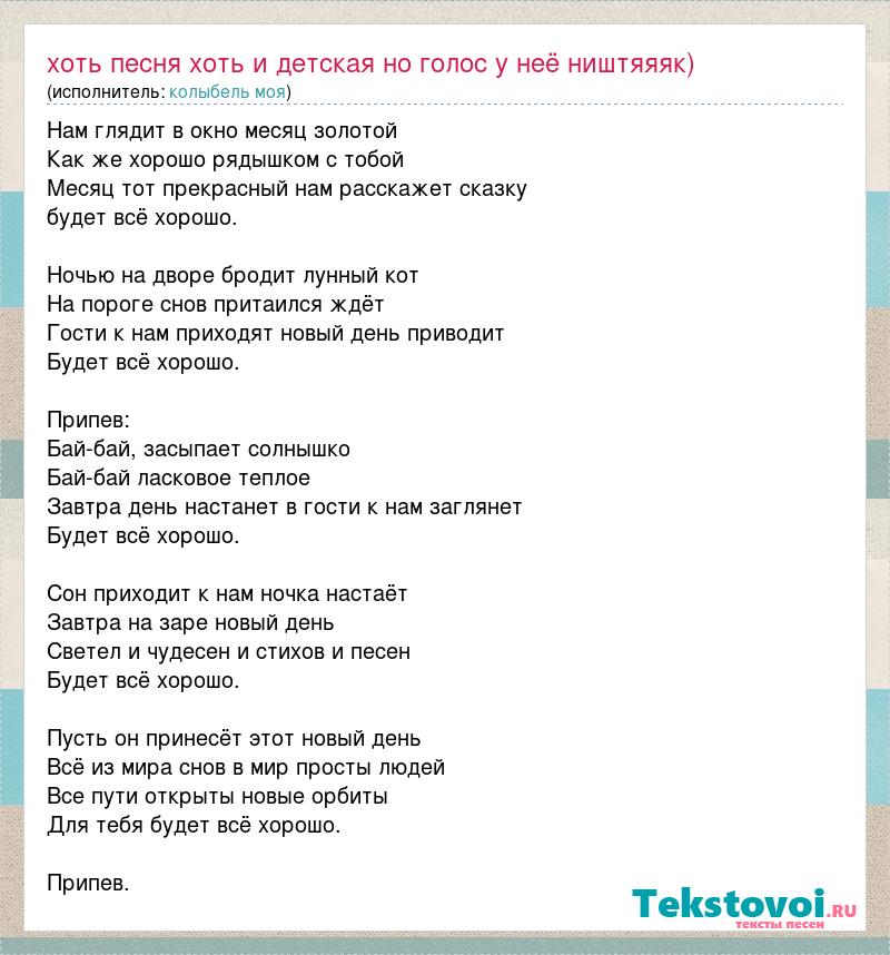 Нам глядит в окно месяц золотой Как же хорошо рядышком с тобой Месяц тот прекрасный нам расскажет сказку будет всё хорошо. Ночью на дворе бродит лунный кот На пороге снов притаился ждёт Гости к нам приходят новый день приводит Будет всё хорошо. Припев: Бай-бай, засыпает солнышко Бай-бай ласковое теплое Завтра день настанет в гости к нам заглянет Будет всё хорошо. Сон приходит к нам ночка настаёт Завтра на заре новый день Светел и чудесен и стихов и песен Будет всё хорошо. Пусть он принесёт этот новый день Всё из мира снов в мир просты людей Все пути открыты новые орбиты Для тебя будет всё хорошо. Припев.