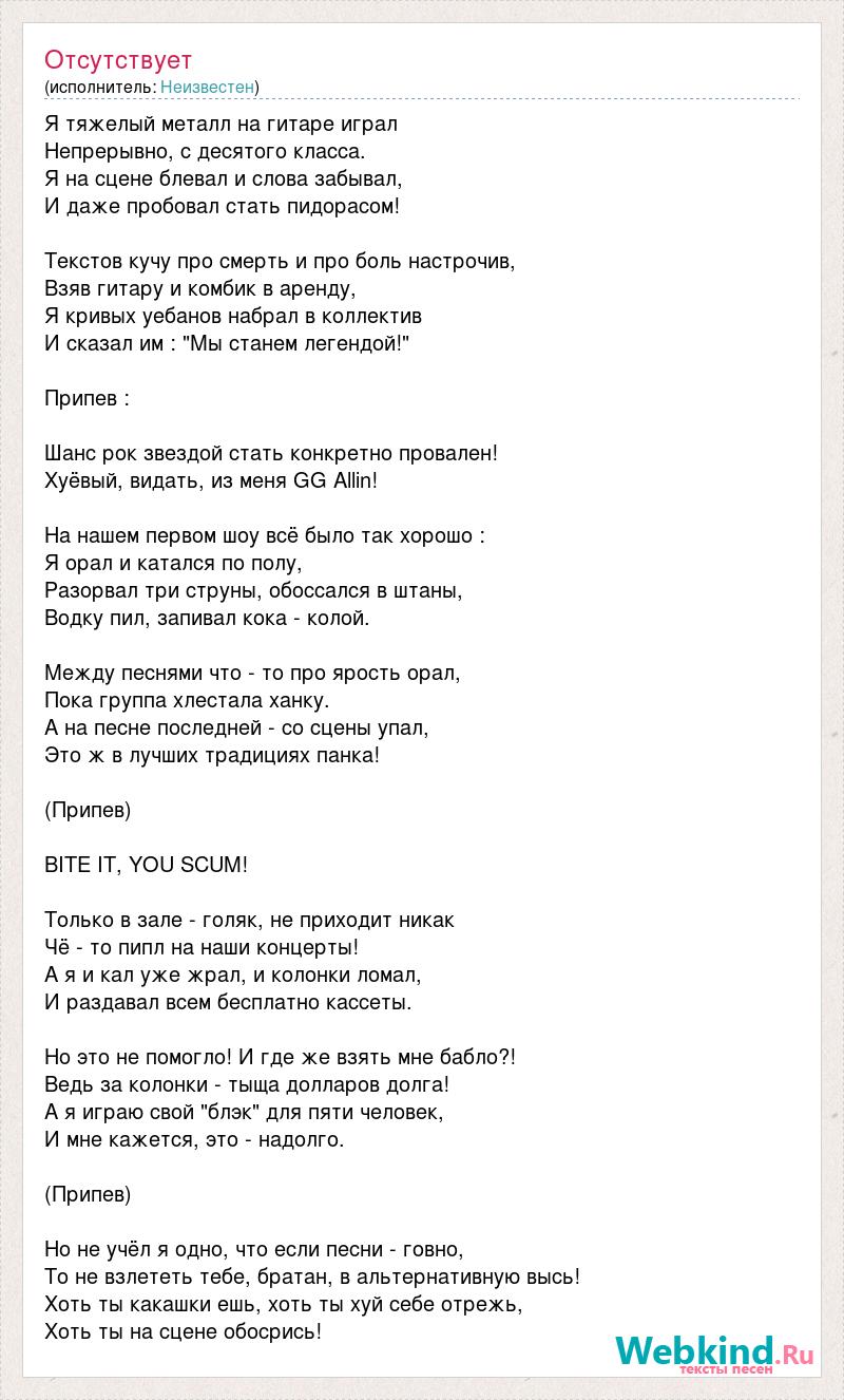 Я тяжелый металл на гитаре играл Непрерывно, с десятого класса. Я на сцене блевал и слова забывал, И даже пробовал стать пидорасом! Текстов кучу про смерть и про боль настрочив, Взяв гитару и комбик в аренду, Я кривых уебанов набрал в коллектив И сказал им : "Мы станем легендой!" Припев : Шанс рок звездой стать конкретно провален! Хуёвый, видать, из меня GG Allin! На нашем первом шоу всё было так хорошо : Я орал и катался по полу, Разорвал три струны, обоссался в штаны, Водку пил, запивал кока - колой. Между песнями что - то про ярость орал, Пока группа хлестала ханку. А на песне последней - со сцены упал, Это ж в лучших традициях панка! (Припев) BITE IT, YOU SCUM! Только в зале - голяк, не приходит никак Чё - то пипл на наши концерты! А я и кал уже жрал, и колонки ломал, И раздавал всем бесплатно кассеты. Но это не помогло! И где же взять мне бабло?! Ведь за колонки - тыща долларов долга! А я играю свой "блэк" для пяти человек, И мне кажется, это - надолго. (Припев) Но не учёл я одно, что если песни - говно, То не взлететь тебе, братан, в альтернативную высь! Хоть ты какашки ешь, хоть ты хуй себе отрежь, Хоть ты на сцене обосрись!