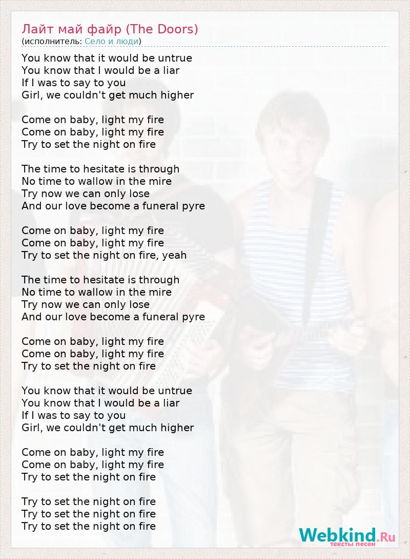 You know that it would be untrue You know that I would be a liar If I was to say to you Girl, we couldn't get much higher Come on baby, light my fire Come on baby, light my fire Try to set the night on fire The time to hesitate is through No time to wallow in the mire Try now we can only lose And our love become a funeral pyre Come on baby, light my fire Come on baby, light my fire Try to set the night on fire, yeah The time to hesitate is through No time to wallow in the mire Try now we can only lose And our love become a funeral pyre Come on baby, light my fire Come on baby, light my fire Try to set the night on fire You know that it would be untrue You know that I would be a liar If I was to say to you Girl, we couldn't get much higher Come on baby, light my fire Come on baby, light my fire Try to set the night on fire Try to set the night on fire Try to set the night on fire Try to set the night on fire