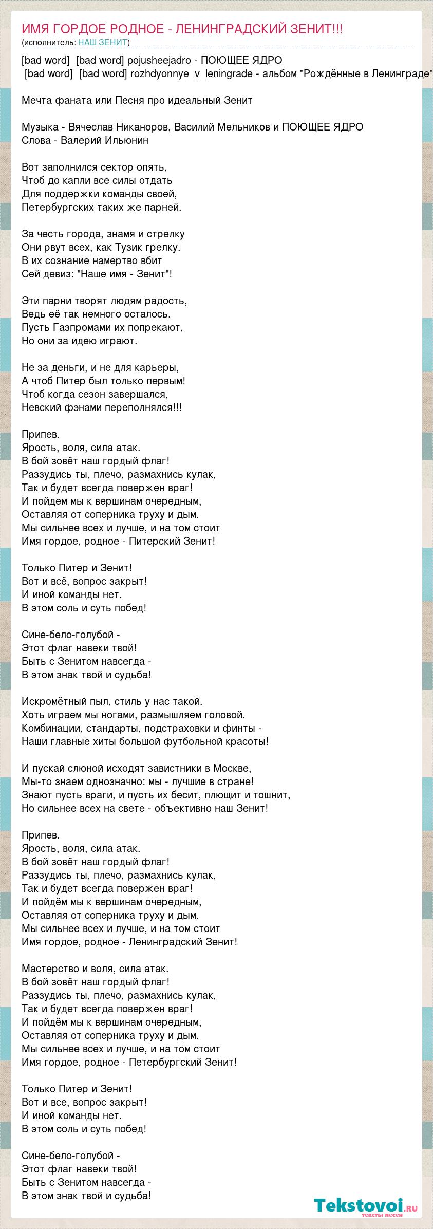 [bad word] [bad word] pojusheejadro - ПОЮЩЕЕ ЯДРО [bad word] [bad word] rozhdyonnye_v_leningrade - альбом "Рождённые в Ленинграде" Мечта фаната или Песня про идеальный Зенит Музыка - Вячеслав Никаноров, Василий Мельников и ПОЮЩЕЕ ЯДРО Слова - Валерий Ильюнин Вот заполнился сектор опять, Чтоб до капли все силы отдать Для поддержки команды своей, Петербургских таких же парней. За честь города, знамя и стрелку Они рвут всех, как Тузик грелку. В их сознание намертво вбит Сей девиз: "Наше имя - Зенит"! Эти парни творят людям радость, Ведь её так немного осталось. Пусть Газпромами их попрекают, Но они за идею играют. Не за деньги, и не для карьеры, А чтоб Питер был только первым! Чтоб когда сезон завершался, Невский фэнами переполнялся!!! Припев. Ярость, воля, сила атак. В бой зовёт наш гордый флаг! Раззудись ты, плечо, размахнись кулак, Так и будет всегда повержен враг! И пойдем мы к вершинам очередным, Оставляя от соперника труху и дым. Мы сильнее всех и лучше, и на том стоит Имя гордое, родное - Питерский Зенит! Только Питер и Зенит! Вот и всё, вопрос закрыт! И иной команды нет. В этом соль и суть побед! Сине-бело-голубой - Этот флаг навеки твой! Быть с Зенитом навсегда - В этом знак твой и судьба! Искромётный пыл, стиль у нас такой. Хоть играем мы ногами, размышляем головой. Комбинации, стандарты, подстраховки и финты - Наши главные хиты большой футбольной красоты! И пускай слюной исходят завистники в Москве, Мы-то знаем однозначно: мы - лучшие в стране! Знают пусть враги, и пусть их бесит, плющит и тошнит, Но сильнее всех на свете - объективно наш Зенит! Припев. Ярость, воля, сила атак. В бой зовёт наш гордый флаг! Раззудись ты, плечо, размахнись кулак, Так и будет всегда повержен враг! И пойдём мы к вершинам очередным, Оставляя от соперника труху и дым. Мы сильнее всех и лучше, и на том стоит Имя гордое, родное - Ленинградский Зенит! Мастерство и воля, сила атак. В бой зовёт наш гордый флаг! Раззудись ты, плечо, размахнись кулак, Так и будет всегда повержен враг! И пойдём мы к вершинам очередным, Оставляя от соперника труху и дым. Мы сильнее всех и лучше, и на том стоит Имя гордое, родное - Петербургский Зенит! Только Питер и Зенит! Вот и все, вопрос закрыт! И иной команды нет. В этом соль и суть побед! Сине-бело-голубой - Этот флаг навеки твой! Быть с Зенитом навсегда - В этом знак твой и судьба!