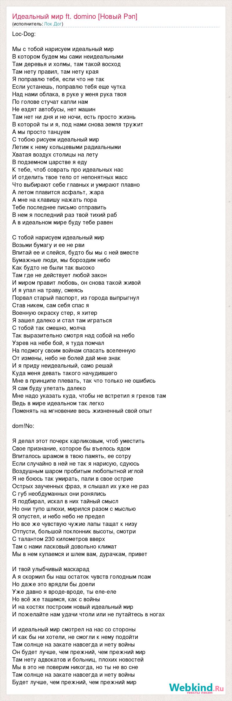 Loc-Dog: Мы с тобой нарисуем идеальный мир В котором будем мы сами неидеальными Там деревья и холмы, там такой восход Там нету правил, там нету края Я поправлю тебя, если что не так Если устанешь, поправлю тебя еще чутка Над нами облака, в руке у меня рука твоя По голове стучат капли нам Не ездят автобусы, нет машин Там нет ни дня и не ночи, есть просто жизнь В которой ты и я, под нами снова земля тружит А мы просто танцуем С тобою рисуем идеальный мир Летим к нему кольцевыми радиальными Хватая воздух столицы на лету В подземном царстве я еду К тебе, чтоб соврать про идеальных нас И отделить твое тело от непонятных масс Что выбирают себе главных и умирают плавно А летом плавится асфальт, жара А мне на клавишу нажать пора Тебе последнее письмо отправить В нем я последний раз твой тихий раб А в идеальном мире буду тебе равен С тобой нарисуем идеальный мир Возьми бумагу и ее не рви Впитай ее и слейся, будто бы мы с ней вместе Бумажные люди, мы бороздим небо Как будто не были так высоко Там где не действует любой закон И миром правит любовь, он снова такой живой И я упал на траву, смеясь Порвал старый паспорт, из города выпрыгнул Став никем, сам себя спас я Военную окраску стер, я хитер Я зашел далеко и стал там играться С тобой так смешно, молча Так выразительно смотря над собой на небо Узрев на небе бой, я туда помчал На подмогу своим войнам спасать вселенную От измены, небо не болей дай мне знак И я приду неидеальный, само решай Куда меня девать такого начудившего Мне в принципе плевать, так что только не ошибись Я сам буду улетать далеко Мне надо указать куда, чтобы не встретил я грехов там Ведь в мире идеальном так легко Поменять на мгновение весь жизненный свой опыт dom!No: Я делал этот почерк карликовым, чтоб уместить Свое признание, которое бы въелось ядом Впиталось шрамом в твою память, ее сотру Если случайно в ней не так я нарисую, сдуюсь Воздушным шаром пробитым любопытной иглой Я не боюсь так умирать, пали в свое острие Острых заученных фраз, я слышал их уже не раз С губ необдуманных они ронялись Я подбирал, искал в них тайный смысл Но они тупо шлюхи, мирился разом с мыслью Я опустел, и небо небо не предел Но все же чувствую чужие лапы тащат к низу Отпусти, большой поклонник высоты, смотри С талантом 230 километров вверх Там с нами ласковый довольно климат Мы в нем купаемся и шлем вам, дурачкам, привет И твой улыбчивый маскарад А я скормил бы наш остаток чувств голодным псам Но даже это врядли бы доели Уже давно я вроде-вроде, ты еле-еле Но всё же тащимся, как с войны И на костях построим новый идеальный мир И пожелайте нам удачи чтоли или не путайтесь в ногах И идеальный мир смотрел на нас со стороны И как бы ни хотели, не смогли к нему подойти Там солнце на закате навсегда и нету войны Он будет лучше, чем прежний, чем прежний мир Там нету адвокатов и больниц, плохих новостей Мы в это не поверим никогда, но ты не во сне Там солнце на закате навсегда и нету войны Будет лучше, чем прежний, чем прежний мир