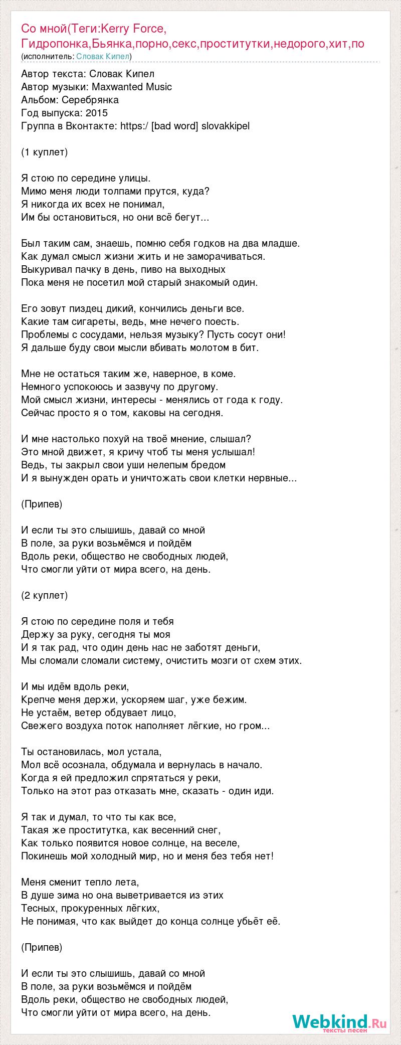 Автор текста: Словак Кипел Автор музыки: Maxwanted Music Альбом: Серебрянка Год выпуска: 2015 Группа в Вконтакте: https:/ [bad word] slovakkipel (1 куплет) Я стою по середине улицы. Мимо меня люди толпами прутся, куда? Я никогда их всех не понимал, Им бы остановиться, но они всё бегут... Был таким сам, знаешь, помню себя годков на два младше. Как думал смысл жизни жить и не заморачиваться. Выкуривал пачку в день, пиво на выходных Пока меня не посетил мой старый знакомый один. Его зовут пиздец дикий, кончились деньги все. Какие там сигареты, ведь, мне нечего поесть. Проблемы с сосудами, нельзя музыку? Пусть сосут они! Я дальше буду свои мысли вбивать молотом в бит. Мне не остаться таким же, наверное, в коме. Немного успокоюсь и зазвучу по другому. Мой смысл жизни, интересы - менялись от года к году. Сейчас просто я о том, каковы на сегодня. И мне настолько похуй на твоё мнение, слышал? Это мной движет, я кричу чтоб ты меня услышал! Ведь, ты закрыл свои уши нелепым бредом И я вынужден орать и уничтожать свои клетки нервные... (Припев) И если ты это слышишь, давай со мной В поле, за руки возьмёмся и пойдём Вдоль реки, общество не свободных людей, Что смогли уйти от мира всего, на день. (2 куплет) Я стою по середине поля и тебя Держу за руку, сегодня ты моя И я так рад, что один день нас не заботят деньги, Мы сломали сломали систему, очистить мозги от схем этих. И мы идём вдоль реки, Крепче меня держи, ускоряем шаг, уже бежим. Не устаём, ветер обдувает лицо, Свежего воздуха поток наполняет лёгкие, но гром... Ты остановилась, мол устала, Мол всё осознала, обдумала и вернулась в начало. Когда я ей предложил спрятаться у реки, Только на этот раз отказать мне, сказать - один иди. Я так и думал, то что ты как все, Такая же проститутка, как весенний снег, Как только появится новое солнце, на веселе, Покинешь мой холодный мир, но и меня без тебя нет! Меня сменит тепло лета, В душе зима но она выветривается из этих Тесных, прокуренных лёгких, Не понимая, что как выйдет до конца солнце убьёт её. (Припев) И если ты это слышишь, давай со мной В поле, за руки возьмёмся и пойдём Вдоль реки, общество не свободных людей, Что смогли уйти от мира всего, на день.