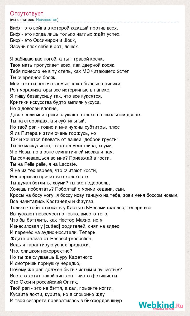 Биф - это война в которой каждый против всех, Биф - это когда лишь только наглых ждёт успех. Биф - это Оксимирон и Шокк, Засунь глок себе в рот, лошок. Я забиваю вас ногой, а ты - травой косяк, Твоя мать пропускает всех, как дверной косяк. Тебя понесло не в ту степь, как MC читающего 2степ Ты очередной босяк. Мои тексты непечатаемые, как обычные пряники, Рэп-морализаторы все истеричные в панике, Я пишу безвкусицу так, что все куксятся, Критики искусства будто выпили уксуса. Но я доволен вполне, Даже если мои трэки слушают только на школьном дворе. Ты на стероидах, а я субтильный, Но твой рэп - говно и мне нужны субтитры, плюс Я из Питера и этим очень горжусь, но Так и хочется блевать от вашей "доброй грусти". Ты не маскулинен, ты съел мескалина, хоуми, Я с Невы, но в рэпе симпатичней москали нам. Ты сомневаешься во мне? Приезжай в гости. Ты на Pelle pelle, я на Lacoste. Я не из тех евреев, что считают кости, Непрерывно причитая о холокосте. Ты думал бэтлить, хоуми? ты же недоросль, Хочешь поболтать? Поболтай с моими кедами, сын. Кросы на босу ногу, я боссу нову танцую на тебе, зови меня боссом новым. Все начитались Кастанеды и Фаулза, Только чтобы отсосать у Касты с KRecами фаллос, теперь все Выпускают повсеместно говно, вместо того, Что бы бэттлить, как Нестор Махно, но я Изнасиловал у [cutted] родителей, снял на видео И перенёс на аудио-носители. Теперь Ждите релиза от Respect-production, Ведь я гарантирую успех продажи. Что, слишком некорректно? Но ты же слушаешь Шуру Каретного И смотришь порнушку нередко, Почему же рэп должен быть чистым и пушистым? Все кто хотят такой хип-хоп - чисто фетишисты. Это Окси и российский Оптик, Твой рэп - это не бэттл, а кал, грызите ногти, Кусайте локти, курите, но я спокойно жду И твоя сигарета превратилась в бикфордов шнур