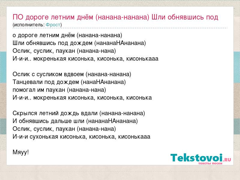 о дороге летним днём (нанана-нанана) Шли обнявшись под дождем (нананаНАнанана) Ослик, суслик, паукан (нанана-нана) И-и-и.. мокренькая кисонька, кисонька, кисонькааа Ослик с сусликом вдвоем (нанана-нанана) Танцевали под дождем (нанаНАнанана) помогал им паукан (нанана-нана) И-и-и.. мокренькая кисонька, кисонька, кисонька Скрылся летний дождь вдали (нанана-нанана) И обнявшись дальше шли (нананаНАнанана) Ослик, суслик, паукан (нанана-нана) И-и-и сухонькая кисонька, кисонька, кисонькааа Мяуу!