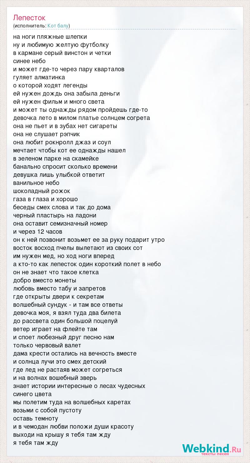 на ноги пляжные шлепки ну и любимую желтую футболку в кармане серый винстон и четки синее небо и может где-то через пару кварталов гуляет алматинка о которой ходят легенды ей нужен дождь она забыла деньги ей нужен фильм и много света и может ты однажды рядом пройдешь где-то девочка лето в милом платье солнцем согрета она не пьет и в зубах нет сигареты она не слушает рэпчик она любит рокнролл джаз и соул мечтает чтобы кот ее однажды нашел в зеленом парке на скамейке банально спросит сколько времени девушка лишь улыбкой ответит ванильное небо шоколадный рожок газа в глаза и хорошо беседы смех слова и так до дома черный пластырь на ладони она оставит семизначный номер и через 12 часов он к ней позвонит возьмет ее за руку подарит утро восток восход пчелы вылетают из своих сот им нужен мед, но ход ноги вперед а кто-то как лепесток один короткий полет в небо он не знает что такое клетка добро вместо монеты любовь вместо табу и запретов где открыты двери к секретам волшебный сундук - и там все ответы девочка моя, я взял туда два билета до рассвета один большой поцелуй ветер играет на флейте там и споет любезный друг песню нам только червовый валет дама крести остались на вечность вместе и солнца лучи это смех детский где лед не растаяв может согреться и на волнах вошебный зверь знает истории интересные о лесах чудесных синего цвета мы полетим туда на волшебных каретах возьми с собой пустоту оставь темноту и в чемодан любви положи души красоту выходи на крышу я тебя там жду я тебя там жду