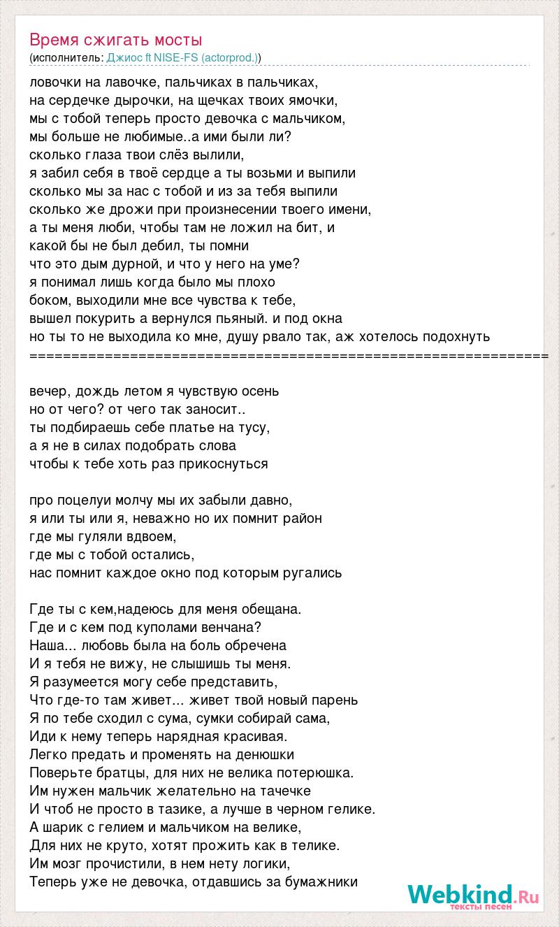 ловочки на лавочке, пальчиках в пальчиках, на сердечке дырочки, на щечках твоих ямочки, мы c тобой теперь просто девочка с мальчиком, мы больше не любимые..а ими были ли? сколько глаза твои слёз вылили, я забил себя в твоё сердце а ты возьми и выпили сколько мы за нас с тобой и из за тебя выпили сколько же дрожи при произнесении твоего имени, а ты меня люби, чтобы там не ложил на бит, и какой бы не был дебил, ты помни что это дым дурной, и что у него на уме? я понимал лишь когда было мы плохо боком, выходили мне все чувства к тебе, вышел покурить а вернулся пьяный. и под окна но ты то не выходила ко мне, душу рвало так, аж хотелось подохнуть ============================================================== вечер, дождь летом я чувствую осень но от чего? от чего так заносит.. ты подбираешь себе платье на тусу, а я не в силах подобрать слова чтобы к тебе хоть раз прикоснуться про поцелуи молчу мы их забыли давно, я или ты или я, неважно но их помнит район где мы гуляли вдвоем, где мы с тобой остались, нас помнит каждое окно под которым ругались Где ты с кем,надеюсь для меня обещана. Где и с кем под куполами венчана? Наша... любовь была на боль обречена И я тебя не вижу, не слышишь ты меня. Я разумеется могу себе представить, Что где-то там живет... живет твой новый парень Я по тебе сходил с сума, сумки собирай сама, Иди к нему теперь нарядная красивая. Легко предать и променять на денюшки Поверьте братцы, для них не велика потерюшка. Им нужен мальчик желательно на тачечке И чтоб не просто в тазике, а лучше в черном гелике. А шарик с гелием и мальчиком на велике, Для них не круто, хотят прожить как в телике. Им мозг прочистили, в нем нету логики, Теперь уже не девочка, отдавшись за бумажники