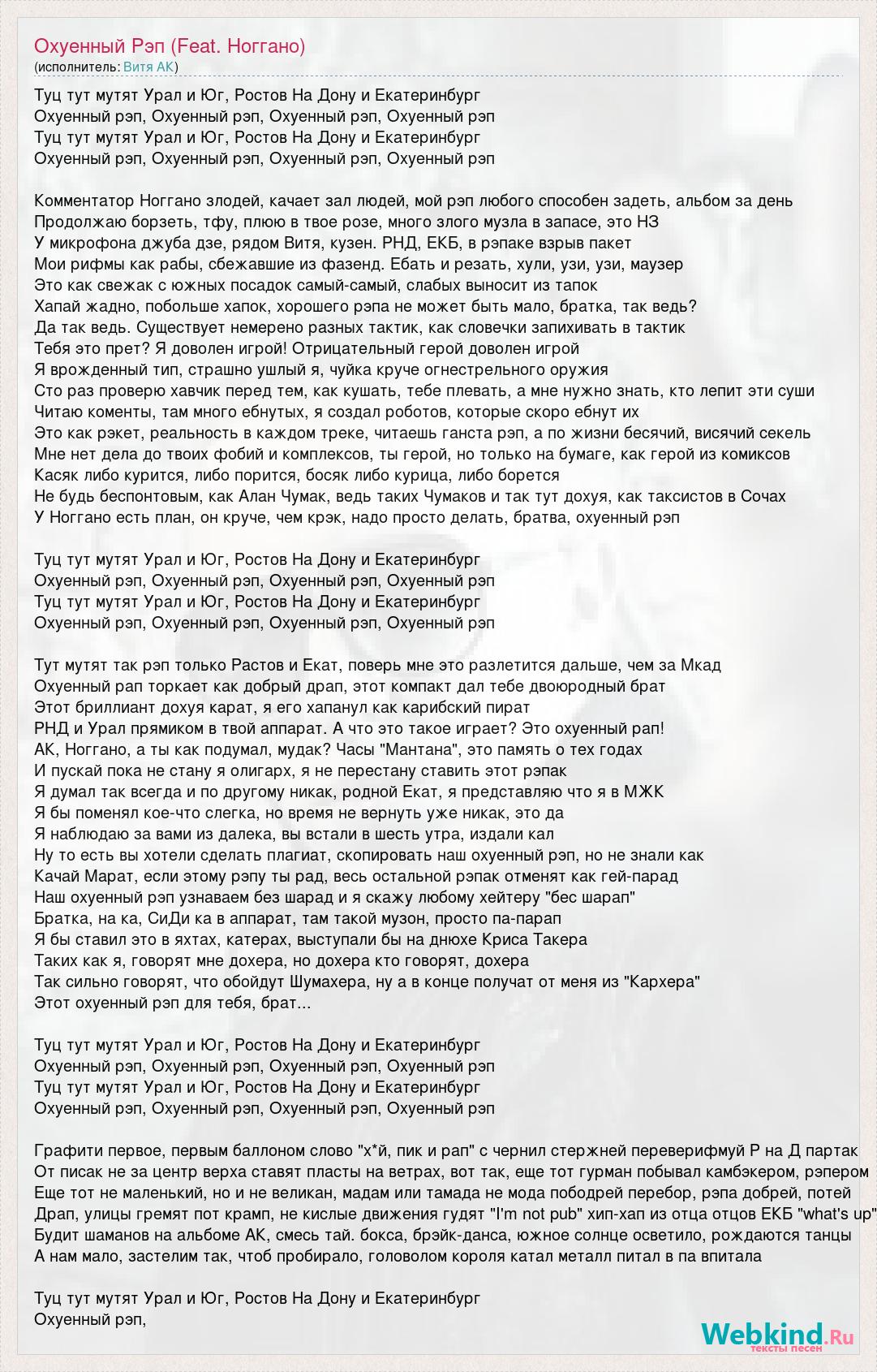 Туц тут мутят Урал и Юг, Ростов На Дону и Екатеринбург Охуенный рэп, Охуенный рэп, Охуенный рэп, Охуенный рэп Туц тут мутят Урал и Юг, Ростов На Дону и Екатеринбург Охуенный рэп, Охуенный рэп, Охуенный рэп, Охуенный рэп Комментатор Ноггано злодей, качает зал людей, мой рэп любого способен задеть, альбом за день Продолжаю борзеть, тфу, плюю в твое розе, много злого музла в запасе, это НЗ У микрофона джуба дзе, рядом Витя, кузен. РНД, ЕКБ, в рэпаке взрыв пакет Мои рифмы как рабы, сбежавшие из фазенд. Ебать и резать, хули, узи, узи, маузер Это как свежак с южных посадок самый-самый, слабых выносит из тапок Хапай жадно, побольше хапок, хорошего рэпа не может быть мало, братка, так ведь? Да так ведь. Существует немерено разных тактик, как словечки запихивать в тактик Тебя это прет? Я доволен игрой! Отрицательный герой доволен игрой Я врожденный тип, страшно ушлый я, чуйка круче огнестрельного оружия Сто раз проверю хавчик перед тем, как кушать, тебе плевать, а мне нужно знать, кто лепит эти суши Читаю коменты, там много ебнутых, я создал роботов, которые скоро ебнут их Это как рэкет, реальность в каждом треке, читаешь ганста рэп, а по жизни бесячий, висячий секель Мне нет дела до твоих фобий и комплексов, ты герой, но только на бумаге, как герой из комиксов Касяк либо курится, либо порится, босяк либо курица, либо борется Не будь беспонтовым, как Алан Чумак, ведь таких Чумаков и так тут дохуя, как таксистов в Сочах У Ноггано есть план, он круче, чем крэк, надо просто делать, братва, охуенный рэп Туц тут мутят Урал и Юг, Ростов На Дону и Екатеринбург Охуенный рэп, Охуенный рэп, Охуенный рэп, Охуенный рэп Туц тут мутят Урал и Юг, Ростов На Дону и Екатеринбург Охуенный рэп, Охуенный рэп, Охуенный рэп, Охуенный рэп Тут мутят так рэп только Растов и Екат, поверь мне это разлетится дальше, чем за Мкад Охуенный рап торкает как добрый драп, этот компакт дал тебе двоюродный брат Этот бриллиант дохуя карат, я его хапанул как карибский пират РНД и Урал прямиком в твой аппарат. А что это такое играет? Это охуенный рап! АК, Ноггано, а ты как подумал, мудак? Часы "Мантана", это память о тех годах И пускай пока не стану я олигарх, я не перестану ставить этот рэпак Я думал так всегда и по другому никак, родной Екат, я представляю что я в МЖК Я бы поменял кое-что слегка, но время не вернуть уже никак, это да Я наблюдаю за вами из далека, вы встали в шесть утра, издали кал Ну то есть вы хотели сделать плагиат, скопировать наш охуенный рэп, но не знали как Качай Марат, если этому рэпу ты рад, весь остальной рэпак отменят как гей-парад Наш охуенный рэп узнаваем без шарад и я скажу любому хейтеру "бес шарап" Братка, на ка, СиДи ка в аппарат, там такой музон, просто па-парап Я бы ставил это в яхтах, катерах, выступали бы на днюхе Криса Такера Таких как я, говорят мне дохера, но дохера кто говорят, дохера Так сильно говорят, что обойдут Шумахера, ну а в конце получат от меня из "Кархера" Этот охуенный рэп для тебя, брат... Туц тут мутят Урал и Юг, Ростов На Дону и Екатеринбург Охуенный рэп, Охуенный рэп, Охуенный рэп, Охуенный рэп Туц тут мутят Урал и Юг, Ростов На Дону и Екатеринбург Охуенный рэп, Охуенный рэп, Охуенный рэп, Охуенный рэп Графити первое, первым баллоном слово "х*й, пик и рап" с чернил стержней переверифмуй Р на Д партак От писак не за центр верха ставят пласты на ветрах, вот так, еще тот гурман побывал камбэ