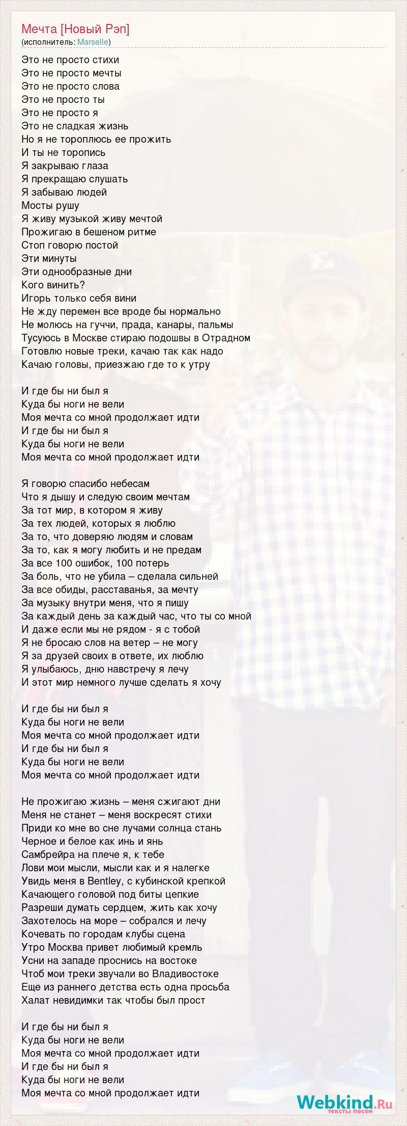 Это не просто стихи Это не просто мечты Это не просто слова Это не просто ты Это не просто я Это не сладкая жизнь Но я не тороплюсь ее прожить И ты не торопись Я закрываю глаза Я прекращаю слушать Я забываю людей Мосты рушу Я живу музыкой живу мечтой Прожигаю в бешеном ритме Стоп говорю постой Эти минуты Эти однообразные дни Кого винить? Игорь только себя вини Не жду перемен все вроде бы нормально Не молюсь на гуччи, прада, канары, пальмы Тусуюсь в Москве стираю подошвы в Отрадном Готовлю новые треки, качаю так как надо Качаю головы, приезжаю где то к утру И где бы ни был я Куда бы ноги не вели Моя мечта со мной продолжает идти И где бы ни был я Куда бы ноги не вели Моя мечта со мной продолжает идти Я говорю спасибо небесам Что я дышу и следую своим мечтам За тот мир, в котором я живу За тех людей, которых я люблю За то, что доверяю людям и словам За то, как я могу любить и не предам За все 100 ошибок, 100 потерь За боль, что не убила – сделала сильней За все обиды, расставанья, за мечту За музыку внутри меня, что я пишу За каждый день за каждый час, что ты со мной И даже если мы не рядом - я с тобой Я не бросаю слов на ветер – не могу Я за друзей своих в ответе, их люблю Я улыбаюсь, дню навстречу я лечу И этот мир немного лучше сделать я хочу И где бы ни был я Куда бы ноги не вели Моя мечта со мной продолжает идти И где бы ни был я Куда бы ноги не вели Моя мечта со мной продолжает идти Не прожигаю жизнь – меня сжигают дни Меня не станет – меня воскресят стихи Приди ко мне во сне лучами солнца стань Черное и белое как инь и янь Самбрейра на плече я, к тебе Лови мои мысли, мысли как и я налегке Увидь меня в Bentley, с кубинской крепкой Качающего головой под биты цепкие Разреши думать сердцем, жить как хочу Захотелось на море – собрался и лечу Кочевать по городам клубы сцена Утро Москва привет любимый кремль Усни на западе проснись на востоке Чтоб мои треки звучали во Владивостоке Еще из раннего детства есть одна просьба Халат невидимки так чтобы был прост И где бы ни был я Куда бы ноги не вели Моя мечта со мной продолжает идти И где бы ни был я Куда бы ноги не вели Моя мечта со мной продолжает идти
