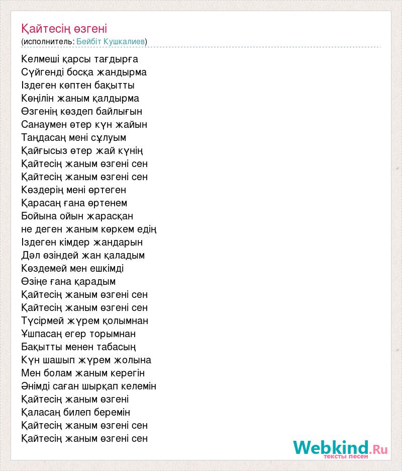 Келмеші қарсы тағдырға Сүйгенді босқа жандырма Іздеген көптен бақытты Көңілін жаным қалдырма Өзгенің көздеп байлығын Санаумен өтер күн жайын Таңдасаң мені сұлуым Қайғысыз өтер жай күнің Қайтесің жаным өзгені сен Қайтесің жаным өзгені сен Көздерің мені өртеген Қарасаң ғана өртенем Бойына ойын жарасқан не деген жаным көркем едің Іздеген кімдер жандарын Дәл өзіндей жан қаладым Көздемей мен ешкімді Өзіңе ғана қарадым Қайтесің жаным өзгені сен Қайтесің жаным өзгені сен Түсірмей жүрем қолымнан Ұшпасаң егер торымнан Бақытты менен табасың Күн шашып жүрем жолына Мен болам жаным керегін Әнімді саған шырқап келемін Қайтесің жаным өзгені Қаласаң билеп беремін Қайтесің жаным өзгені сен Қайтесің жаным өзгені сен