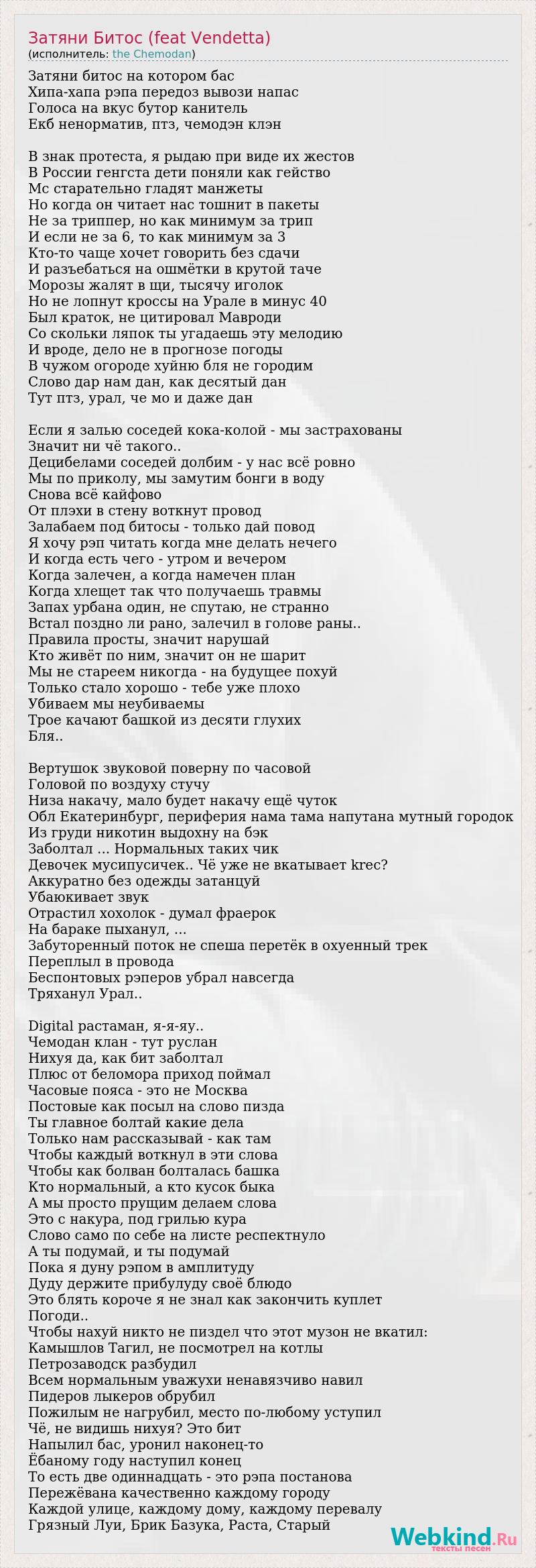 Затяни битос на котором бас Хипа-хапа рэпа передоз вывози напас Голоса на вкус бутор канитель Екб ненорматив, птз, чемодэн клэн В знак протеста, я рыдаю при виде их жестов В России генгста дети поняли как гейство Мс старательно гладят манжеты Но когда он читает нас тошнит в пакеты Не за триппер, но как минимум за трип И если не за 6, то как минимум за 3 Кто-то чаще хочет говорить без сдачи И разъебаться на ошмётки в крутой таче Морозы жалят в щи, тысячу иголок Но не лопнут кроссы на Урале в минус 40 Был краток, не цитировал Мавроди Со скольки ляпок ты угадаешь эту мелодию И вроде, дело не в прогнозе погоды В чужом огороде хуйню бля не городим Слово дар нам дан, как десятый дан Тут птз, урал, че мо и даже дан Если я залью соседей кока-колой - мы застрахованы Значит ни чё такого.. Децибелами соседей долбим - у нас всё ровно Мы по приколу, мы замутим бонги в воду Снова всё кайфово От плэхи в стену воткнут провод Залабаем под битосы - только дай повод Я хочу рэп читать когда мне делать нечего И когда есть чего - утром и вечером Когда залечен, а когда намечен план Когда хлещет так что получаешь травмы Запах урбана один, не спутаю, не странно Встал поздно ли рано, залечил в голове раны.. Правила просты, значит нарушай Кто живёт по ним, значит он не шарит Мы не стареем никогда - на будущее похуй Только стало хорошо - тебе уже плохо Убиваем мы неубиваемы Трое качают башкой из десяти глухих Бля.. Вертушок звуковой поверну по часовой Головой по воздуху стучу Низа накачу, мало будет накачу ещё чуток Обл Екатеринбург, периферия нама тама напутана мутный городок Из груди никотин выдохну на бэк Заболтал ... Нормальных таких чик Девочек мусипусичек.. Чё уже не вкатывает krec? Аккуратно без одежды затанцуй Убаюкивает звук Отрастил хохолок - думал фраерок На бараке пыханул, ... Забуторенный поток не спеша перетёк в охуенный трек Переплыл в провода Беспонтовых рэперов убрал навсегда Тряханул Урал.. Digital растаман, я-я-яу.. Чемодан клан - тут руслан Нихуя да, как бит заболтал Плюс от беломора приход поймал Часовые пояса - это не Москва Постовые как посыл на слово пизда Ты главное болтай какие дела Только нам рассказывай - как там Чтобы каждый воткнул в эти слова Чтобы как болван болталась башка Кто нормальный, а кто кусок быка А мы просто прущим делаем слова Это с накура, под грилью кура Слово само по себе на листе респектнуло А ты подумай, и ты подумай Пока я дуну рэпом в амплитуду Дуду держите прибулуду своё блюдо Это блять короче я не знал как закончить куплет Погоди.. Чтобы нахуй никто не пиздел что этот музон не вкатил: Камышлов Тагил, не посмотрел на котлы Петрозаводск разбудил Всем нормальным уважухи ненавязчиво навил Пидеров лыкеров обрубил Пожилым не нагрубил, место по-любому уступил Чё, не видишь нихуя? Это бит Напылил бас, уронил наконец-то Ёбаному году наступил конец То есть две одиннадцать - это рэпа постанова Пережёвана качественно каждому городу Каждой улице, каждому дому, каждому перевалу Грязный Луи, Брик Базука, Раста, Старый