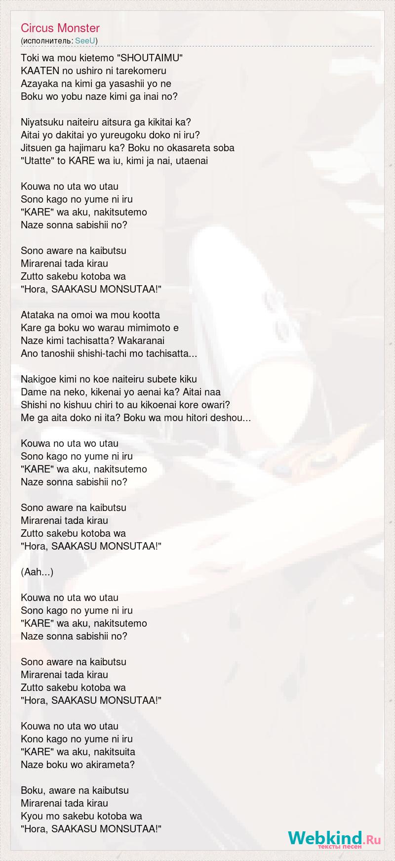 Toki wa mou kietemo "SHOUTAIMU" KAATEN no ushiro ni tarekomeru Azayaka na kimi ga yasashii yo ne Boku wo yobu naze kimi ga inai no? Niyatsuku naiteiru aitsura ga kikitai ka? Aitai yo dakitai yo yureugoku doko ni iru? Jitsuen ga hajimaru ka? Boku no okasareta soba "Utatte" to KARE wa iu, kimi ja nai, utaenai Kouwa no uta wo utau Sono kago no yume ni iru "KARE" wa aku, nakitsutemo Naze sonna sabishii no? Sono aware na kaibutsu Mirarenai tada kirau Zutto sakebu kotoba wa "Hora, SAAKASU MONSUTAA!" Atataka na omoi wa mou kootta Kare ga boku wo warau mimimoto e Naze kimi tachisatta? Wakaranai Ano tanoshii shishi-tachi mo tachisatta... Nakigoe kimi no koe naiteiru subete kiku Dame na neko, kikenai yo aenai ka? Aitai naa Shishi no kishuu chiri to au kikoenai kore owari? Me ga aita doko ni ita? Boku wa mou hitori deshou... Kouwa no uta wo utau Sono kago no yume ni iru "KARE" wa aku, nakitsutemo Naze sonna sabishii no? Sono aware na kaibutsu Mirarenai tada kirau Zutto sakebu kotoba wa "Hora, SAAKASU MONSUTAA!" (Aah...) Kouwa no uta wo utau Sono kago no yume ni iru "KARE" wa aku, nakitsutemo Naze sonna sabishii no? Sono aware na kaibutsu Mirarenai tada kirau Zutto sakebu kotoba wa "Hora, SAAKASU MONSUTAA!" Kouwa no uta wo utau Kono kago no yume ni iru "KARE" wa aku, nakitsuita Naze boku wo akirameta? Boku, aware na kaibutsu Mirarenai tada kirau Kyou mo sakebu kotoba wa "Hora, SAAKASU MONSUTAA!"