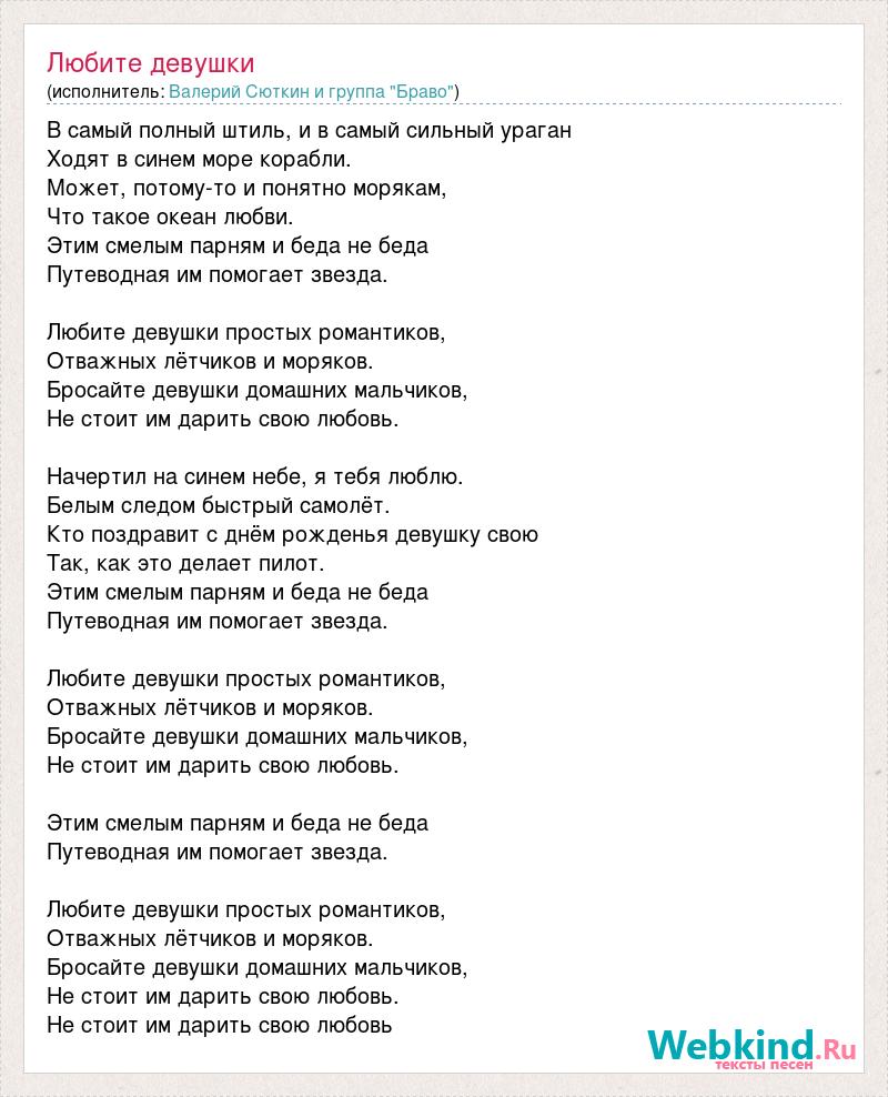 В самый полный штиль, и в самый сильный ураган Ходят в синем море корабли. Может, потому-то и понятно морякам, Что такое океан любви. Этим смелым парням и беда не беда Путеводная им помогает звезда. Любите девушки простых романтиков, Отважных лётчиков и моряков. Бросайте девушки домашних мальчиков, Не стоит им дарить свою любовь. Начертил на синем небе, я тебя люблю. Белым следом быстрый самолёт. Кто поздравит с днём рожденья девушку свою Так, как это делает пилот. Этим смелым парням и беда не беда Путеводная им помогает звезда. Любите девушки простых романтиков, Отважных лётчиков и моряков. Бросайте девушки домашних мальчиков, Не стоит им дарить свою любовь. Этим смелым парням и беда не беда Путеводная им помогает звезда. Любите девушки простых романтиков, Отважных лётчиков и моряков. Бросайте девушки домашних мальчиков, Не стоит им дарить свою любовь. Не стоит им дарить свою любовь