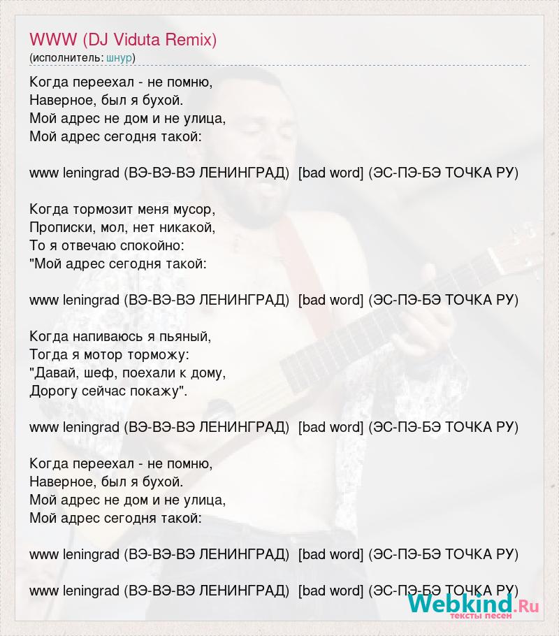 Когда переехал - не помню, Наверное, был я бухой. Мой адрес не дом и не улица, Мой адрес сегодня такой: www leningrad (ВЭ-ВЭ-ВЭ ЛЕНИНГРАД) [bad word] (ЭС-ПЭ-БЭ ТОЧКА РУ) Когда тормозит меня мусор, Прописки, мол, нет никакой, То я отвечаю спокойно: "Мой адрес сегодня такой: www leningrad (ВЭ-ВЭ-ВЭ ЛЕНИНГРАД) [bad word] (ЭС-ПЭ-БЭ ТОЧКА РУ) Когда напиваюсь я пьяный, Тогда я мотор торможу: "Давай, шеф, поехали к дому, Дорогу сейчас покажу". www leningrad (ВЭ-ВЭ-ВЭ ЛЕНИНГРАД) [bad word] (ЭС-ПЭ-БЭ ТОЧКА РУ) Когда переехал - не помню, Наверное, был я бухой. Мой адрес не дом и не улица, Мой адрес сегодня такой: www leningrad (ВЭ-ВЭ-ВЭ ЛЕНИНГРАД) [bad word] (ЭС-ПЭ-БЭ ТОЧКА РУ) www leningrad (ВЭ-ВЭ-ВЭ ЛЕНИНГРАД) [bad word] (ЭС-ПЭ-БЭ ТОЧКА РУ)