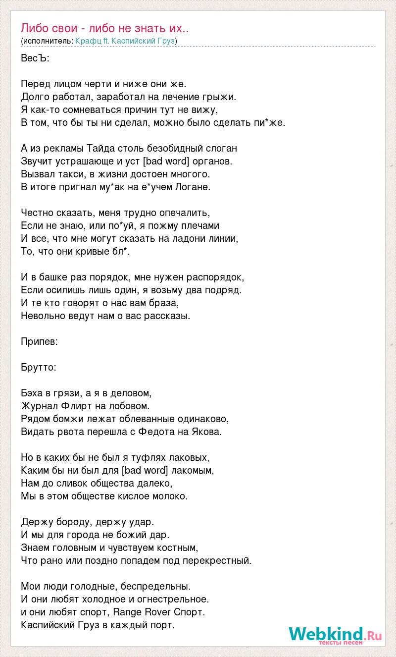 ВесЪ: Перед лицом черти и ниже они же. Долго работал, заработал на лечение грыжи. Я как-то сомневаться причин тут не вижу, В том, что бы ты ни сделал, можно было сделать пи*же. А из рекламы Тайда столь безобидный слоган Звучит устрашающе и уст [bad word] органов. Вызвал такси, в жизни достоен многого. В итоге пригнал му*ак на е*учем Логане. Честно сказать, меня трудно опечалить, Если не знаю, или по*уй, я пожму плечами И все, что мне могут сказать на ладони линии, То, что они кривые бл*. И в башке раз порядок, мне нужен распорядок, Если осилишь лишь один, я возьму два подряд. И те кто говорят о нас вам браза, Невольно ведут нам о вас рассказы. Припев: Брутто: Бэха в грязи, а я в деловом, Журнал Флирт на лобовом. Рядом бомжи лежат облеванные одинаково, Видать рвота перешла с Федота на Якова. Но в каких бы не был я туфлях лаковых, Каким бы ни был для [bad word] лакомым, Нам до сливок общества далеко, Мы в этом обществе кислое молоко. Держу бороду, держу удар. И мы для города не божий дар. Знаем головным и чувствуем костным, Что рано или поздно попадем под перекрестный. Мои люди голодные, беспредельны. И они любят холодное и огнестрельное. и они любят спорт, Range Rover Спорт. Каспийский Груз в каждый порт.