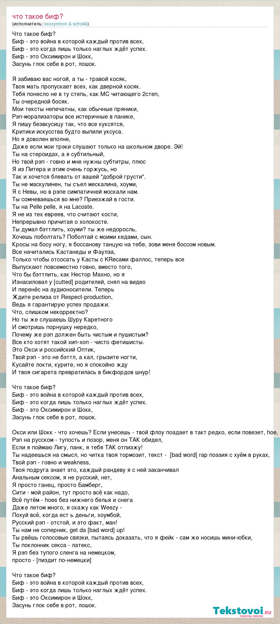 Что такое биф? Биф - это война в которой каждый против всех, Биф - это когда лишь только наглых ждёт успех. Биф - это Оксимирон и Шокк, Засунь глок себе в рот, лошок. Я забиваю вас ногой, а ты - травой косяк, Твоя мать пропускает всех, как дверной косяк. Тебя понесло не в ту степь, как MC читающего 2степ, Ты очередной босяк. Мои тексты непечатны, как обычные пряники, Рэп-морализаторы все истеричные в панике, Я пишу безвкусицу так, что все куксятся, Критики искусства будто выпили уксуса. Но я доволен вполне, Даже если мои трэки слушают только на школьном дворе. Эй! Ты на стероидах, а я субтильный, Но твой рэп - говно и мне нужны субтитры, плюс Я из Питера и этим очень горжусь, но Так и хочется блевать от вашей "доброй грусти". Ты не маскулинен, ты съел мескалина, хоуми, Я с Невы, но в рэпе симпатичней москали нам. Ты сомневаешься во мне? Приезжай в гости. Ты на Pelle pelle, я на Lacoste. Я не из тех евреев, что считают кости, Непрерывно причитая о холокосте. Ты думал бэттлить, хоуми? ты же недоросль, Хочешь поболтать? Поболтай с моими кедами, сын. Кросы на босу ногу, я боссанову танцую на тебе, зови меня боссом новым. Все начитались Кастанеды и Фаулза, Только чтобы отсосать у Касты с KRecами фаллос, теперь все Выпускают повсеместно говно, вместо того, Что бы бэттлить, как Нестор Махно, но я Изнасиловал у [cutted] родителей, снял на видео И перенёс на аудионосители. Теперь Ждите релиза от Respect-production, Ведь я гарантирую успех продажи. Что, слишком некорректно? Но ты же слушаешь Шуру Каретного И смотришь порнушку нередко, Почему же рэп должен быть чистым и пушистым? Все кто хотят такой хип-хоп - чисто фетишисты. Это Окси и российский Оптик, Твой рэп - это не бэттл, а кал, грызите ногти, Кусайте локти, курите, но я спокойно жду И твоя сигарета превратилась в бикфордов шнур! Что такое биф? Биф - это война в которой каждый против всех, Биф - это когда лишь только наглых ждёт успех. Биф - это Оксимирон и Шокк, Засунь глок себе в рот, лошок. Окси или Шокк - что хочешь? Если унесешь - твой флоу поадает в такт редко, если повезет, hoe, Рэп на русском - тупость и позор, меня он ТАК обидел, Если я поймаю Лигу, панк, я тебя ТАК отпизжу! Ты надеешься на смысл, но читка твоя тормозит, текст - [bad word] rap поэзия с хуём в руках, Твой рэп - говно и weakness, Твоя подруга знает это, каждый рандеву я с ней заканчивал Анальным сексом, я не русский, нет, Я просто ганец, просто Бамберг, Сити - мой район, тут просто всё как надо, Всё путём - hoes без нижнего белья и снега Даже летом много, я скажу как Weezy - Похуй всё, когда ест ь деньги, хоумбой, Русский рэп - отстой, и это факт, ман! Ты нам не соперник, get da [bad word] up! Ты рвёшь голосовые связки, пытаясь доказать, что я фейк - сам же носишь мини-юбки, Ты поклонник секса - латекс, Я рэп без тупого сленга на немецком, просто - [пиздит по-немецки] Что такое биф? Биф - это война в которой каждый против всех, Биф - это когда лишь только наглых ждёт успех. Биф - это Оксимирон и Шокк, Засунь глок себе в рот, лошок.