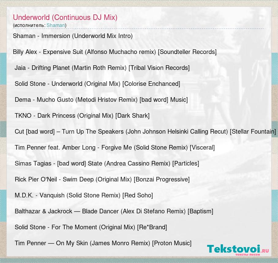 Shaman - Immersion (Underworld Mix Intro) Billy Alex - Expensive Suit (Alfonso Muchacho remix) [Soundteller Records] Jaia - Drifting Planet (Martin Roth Remix) [Tribal Vision Records] Solid Stone - Underworld (Original Mix) [Colorise Enchanced] Dema - Mucho Gusto (Metodi Hristov Remix) [bad word] Music] TKNO - Dark Princess (Original Mix) [Dark Shark] Cut [bad word] – Turn Up The Speakers (John Johnson Helsinki Calling Recut) [Stellar Fountain] Tim Penner feat. Amber Long - Forgive Me (Solid Stone Remix) [Visceral] Simas Tagias - [bad word] State (Andrea Cassino Remix) [Particles] Rick Pier O'Neil - Swim Deep (Original Mix) [Bonzai Progressive] M.D.K. - Vanquish (Solid Stone Remix) [Red Soho] Balthazar & Jackrock — Blade Dancer (Alex Di Stefano Remix) [Baptism] Solid Stone - For The Moment (Original Mix) [Re*Brand] Tim Penner — On My Skin (James Monro Remix) [Proton Music]