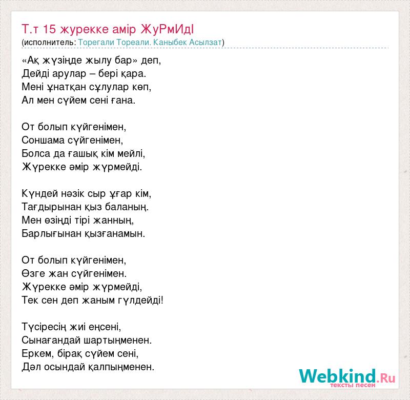 «Ақ жүзіңде жылу бар» деп, Дейді арулар – бері қара. Мені ұнатқан сұлулар көп, Ал мен сүйем сені ғана. От болып күйгенімен, Соншама сүйгенімен, Болса да ғашық кім мейлі, Жүрекке әмір жүрмейді. Күндей нәзік сыр ұғар кім, Тағдырынан қыз баланың. Мен өзіңді тірі жанның, Барлығынан қызғанамын. От болып күйгенімен, Өзге жан сүйгенімен. Жүрекке әмір жүрмейді, Тек сен деп жаным гүлдейді! Түсіресің жиі еңсені, Сынағандай шартыңменен. Еркем, бірақ сүйем сені, Дәл осындай қалпыңменен.