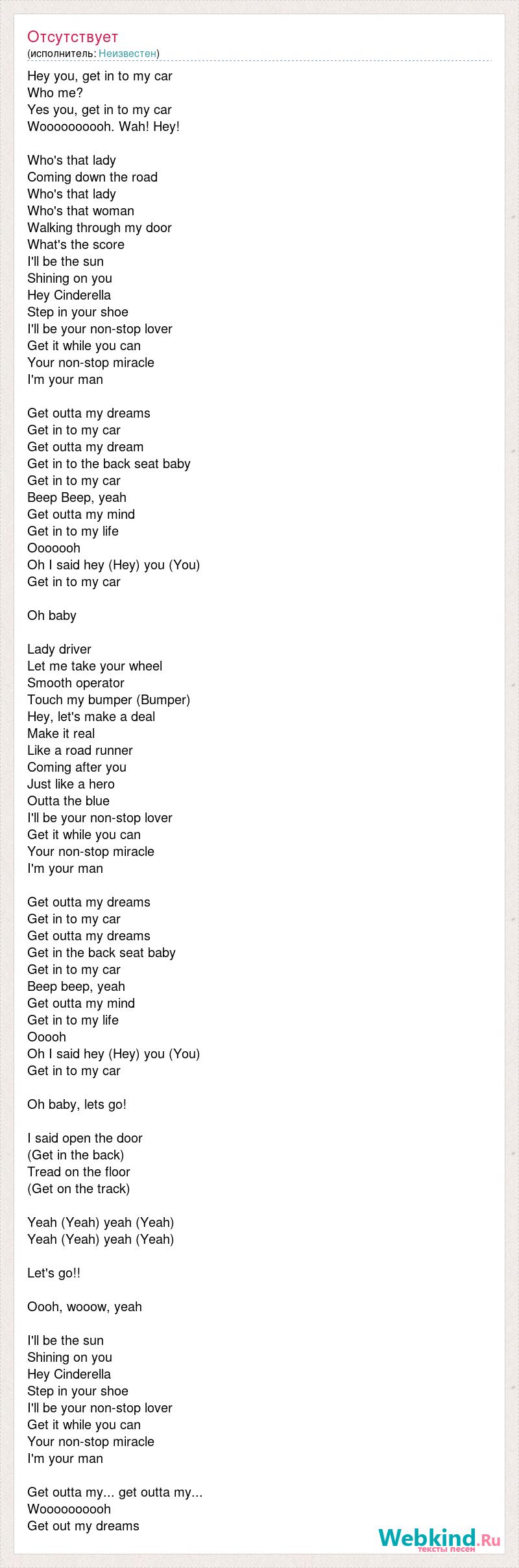 Hey you, get in to my car Who me? Yes you, get in to my car Woooooooooh. Wah! Hey! Who's that lady Coming down the road Who's that lady Who's that woman Walking through my door What's the score I'll be the sun Shining on you Hey Cinderella Step in your shoe I'll be your non-stop lover Get it while you can Your non-stop miracle I'm your man Get outta my dreams Get in to my car Get outta my dream Get in to the back seat baby Get in to my car Beep Beep, yeah Get outta my mind Get in to my life Ooooooh Oh I said hey (Hey) you (You) Get in to my car Oh baby Lady driver Let me take your wheel Smooth operator Touch my bumper (Bumper) Hey, let's make a deal Make it real Like a road runner Coming after you Just like a hero Outta the blue I'll be your non-stop lover Get it while you can Your non-stop miracle I'm your man Get outta my dreams Get in to my car Get outta my dreams Get in the back seat baby Get in to my car Beep beep, yeah Get outta my mind Get in to my life Ooooh Oh I said hey (Hey) you (You) Get in to my car Oh baby, lets go! I said open the door (Get in the back) Tread on the floor (Get on the track) Yeah (Yeah) yeah (Yeah) Yeah (Yeah) yeah (Yeah) Let's go!! Oooh, wooow, yeah I'll be the sun Shining on you Hey Cinderella Step in your shoe I'll be your non-stop lover Get it while you can Your non-stop miracle I'm your man Get outta my... get outta my... Woooooooooh Get out my dreams