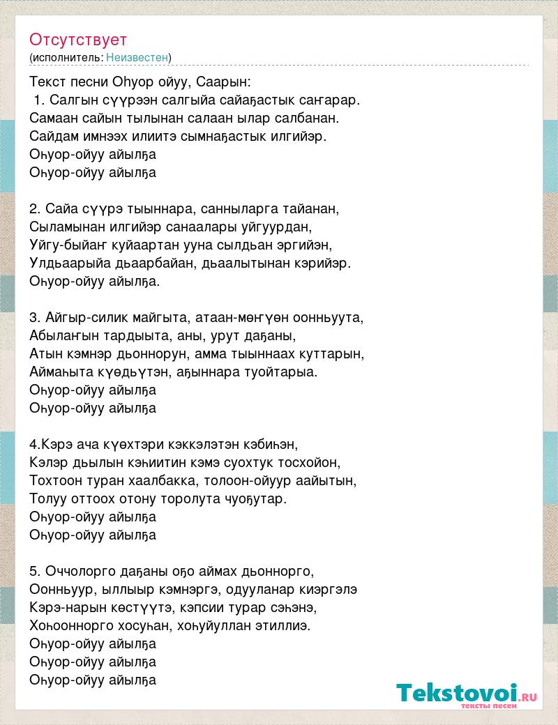 Текст песни Оhуор ойуу, Саарын: 1. Салгын сүүрээн салгыйа сайаҕастык саҥарар. Самаан сайын тылынан салаан ылар салбанан. Сайдам имнээх илиитэ сымнаҕастык илгийэр. Оһуор-ойуу айылҕа Оһуор-ойуу айылҕа 2. Сайа сүүрэ тыыннара, санныларга тайанан, Сыламынан илгийэр санаалары уйгуурдан, Уйгу-быйаҥ куйаартан ууна сылдьан эргийэн, Улдьаарыйа дьаарбайан, дьаалытынан кэрийэр. Оһуор-ойуу айылҕа. 3. Айгыр-силик майгыта, атаан-мөҥүөн оонньуута, Абылаҥын тардыыта, аны, урут даҕаны, Атын кэмнэр дьоннорун, амма тыыннаах куттарын, Аймаһыта күөдьүтэн, аҕыннара туойтарыа. Оһуор-ойуу айылҕа Оһуор-ойуу айылҕа 4.Кэрэ ача күөхтэри кэккэлэтэн кэбиһэн, Кэлэр дьылын кэһиитин кэмэ суохтук тосхойон, Тохтоон туран хаалбакка, толоон-ойуур аайытын, Толуу оттоох отону торолута чуоҕутар. Оһуор-ойуу айылҕа Оһуор-ойуу айылҕа 5. Оччолорго даҕаны оҕо аймах дьоннорго, Оонньуур, ыллыыр кэмнэргэ, одууланар киэргэлэ Кэрэ-нарын көстүүтэ, кэпсии турар сэһэнэ, Хоһооннорго хосуһан, хоһуйуллан этиллиэ. Оһуор-ойуу айылҕа Оһуор-ойуу айылҕа Оһуор-ойуу айылҕа