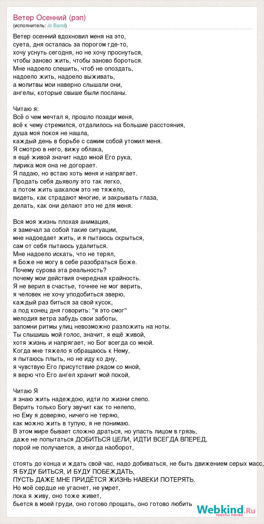 Ветер осенний вдохновил меня на это, суета, дня осталась за порогом где-то, хочу уснуть сегодня, но не хочу проснуться, чтобы заново жить, чтобы заново бороться. Мне надоело спешить, чтоб не опоздать, надоело жить, надоело выживать, а молитвы мои наверно слышали они, ангелы, которые свыше были посланы. Читаю я: Всё о чем мечтал я, прошло позади меня, всё к чему стремился, отдалилось на большие расстояния, душа моя покоя не нашла, каждый день в борьбе с самим собой утомил меня. Я смотрю в него, вижу облака, я ещё живой значит надо мной Его рука, лирика моя она не догорает. Я падаю, но встаю хоть меня и напрягает. Продать себя дьяволу это так легко, а потом жить шакалом это не тяжело, видеть, как страдают многие, и закрывать глаза, делать, как они делают это не для меня. Вся моя жизнь плохая анимация, я замечал за собой такие ситуации, мне надоедает жить, и я пытаюсь скрыться, сам от себя пытаюсь удалиться. Мне надоело искать, что не терял, я Боже не могу в себе разобраться Боже. Почему сурова эта реальность? почему мои действия очередная крайность. Я не верил в счастье, точнее не мог верить, я человек не хочу уподобиться зверю, каждый раз биться за свой кусок, а под конец дня говорить: ''я это смог'' мелодия ветра забудь свои заботы, запомни ритмы улиц невозможно разложить на ноты. Ты слышишь мой голос, значит, я ещё живой, хотя жизнь и напрягает, но Бог всегда со мной. Когда мне тяжело я обращаюсь к Нему, я пытаюсь плыть, но не иду ко дну, я чувствую Его присутствие рядом со мной, я верю что Его ангел хранит мой покой, Читаю Я я знаю жить надеждою, идти по жизни слепо. Верить только Богу звучит как то нелепо, но Ему я доверяю, ничего не теряю, как можно жить в тупую, я не понимаю. В этом мире бывает сложно драться, но упасть лицом в грязь, даже не попытаться ДОБИТЬСЯ ЦЕЛИ, ИДТИ ВСЕГДА ВПЕРЕД, порой не получается, а иногда наоборот, стоять до конца и ждать свой час, надо добиваться, не быть движением серых масс, Я БУДУ БИТЬСЯ, И БУДУ ПОБЕЖДАТЬ, ПУСТЬ ДАЖЕ МНЕ ПРИДЁТСЯ ЖИЗНЬ НАВЕКИ ПОТЕРЯТЬ. Но моё сердце не угаснет, не умрет, пока я живу, оно тоже живет, бьется в моей груди, оно готово прощать, оно готово любить