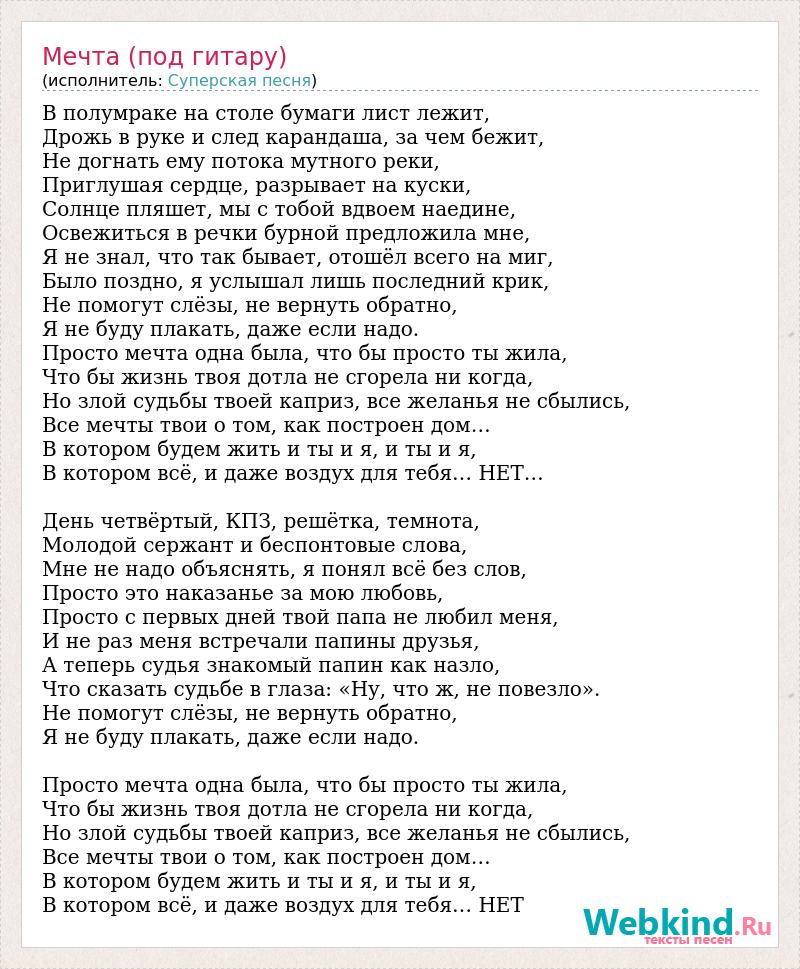В полумраке на столе бумаги лист лежит, Дрожь в руке и след карандаша, за чем бежит, Не догнать ему потока мутного реки, Приглушая сердце, разрывает на куски, Солнце пляшет, мы с тобой вдвоем наедине, Освежиться в речки бурной предложила мне, Я не знал, что так бывает, отошёл всего на миг, Было поздно, я услышал лишь последний крик, Не помогут слёзы, не вернуть обратно, Я не буду плакать, даже если надо. Просто мечта одна была, что бы просто ты жила, Что бы жизнь твоя дотла не сгорела ни когда, Но злой судьбы твоей каприз, все желанья не сбылись, Все мечты твои о том, как построен дом… В котором будем жить и ты и я, и ты и я, В котором всё, и даже воздух для тебя… НЕТ… День четвёртый, КПЗ, решётка, темнота, Молодой сержант и беспонтовые слова, Мне не надо объяснять, я понял всё без слов, Просто это наказанье за мою любовь, Просто с первых дней твой папа не любил меня, И не раз меня встречали папины друзья, А теперь судья знакомый папин как назло, Что сказать судьбе в глаза: «Ну, что ж, не повезло». Не помогут слёзы, не вернуть обратно, Я не буду плакать, даже если надо. Просто мечта одна была, что бы просто ты жила, Что бы жизнь твоя дотла не сгорела ни когда, Но злой судьбы твоей каприз, все желанья не сбылись, Все мечты твои о том, как построен дом… В котором будем жить и ты и я, и ты и я, В котором всё, и даже воздух для тебя… НЕТ