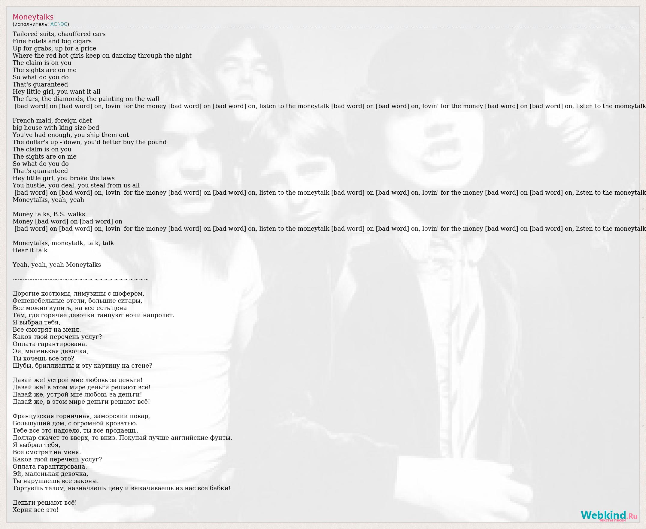 Tailored suits, chauffered cars Fine hotels and big cigars Up for grabs, up for a price Where the red hot girls keep on dancing through the night The claim is on you The sights are on me So what do you do That's guaranteed Hey little girl, you want it all The furs, the diamonds, the painting on the wall [bad word] on [bad word] on, lovin' for the money [bad word] on [bad word] on, listen to the moneytalk [bad word] on [bad word] on, lovin' for the money [bad word] on [bad word] on, listen to the moneytalk French maid, foreign chef big house with king size bed You've had enough, you ship them out The dollar's up - down, you'd better buy the pound The claim is on you The sights are on me So what do you do That's guaranteed Hey little girl, you broke the laws You hustle, you deal, you steal from us all [bad word] on [bad word] on, lovin' for the money [bad word] on [bad word] on, listen to the moneytalk [bad word] on [bad word] on, lovin' for the money [bad word] on [bad word] on, listen to the moneytalk Moneytalks, yeah, yeah Money talks, B.S. walks Money [bad word] on [bad word] on [bad word] on [bad word] on, lovin' for the money [bad word] on [bad word] on, listen to the moneytalk [bad word] on [bad word] on, lovin' for the money [bad word] on [bad word] on, listen to the moneytalk Moneytalks, moneytalk, talk, talk Hear it talk Yeah, yeah, yeah Moneytalks ~~~~~~~~~~~~~~~~~~~~~~~~~~~ Дорогие костюмы, лимузины с шофером, Фешенебельные отели, большие сигары, Все можно купить, на все есть цена Там, где горячие девочки танцуют ночи напролет. Я выбрал тебя, Все смотрят на меня. Каков твой перечень услуг? Оплата гарантирована. Эй, маленькая девочка, Ты хочешь все это? Шубы, бриллианты и эту картину на стене? Давай же! устрой мне любовь за деньги! Давай же! в этом мире деньги решают всё! Давай же, устрой мне любовь за деньги! Давай же, в этом мире деньги решают всё! Французская горничная, заморский повар, Большущий дом, с огромной кроватью. Тебе все это надоело, ты все продаешь. Доллар скачет то вверх, то вниз. Покупай лучше английские фунты. Я выбрал тебя, Все смотрят на меня. Каков твой перечень услуг? Оплата гарантирована. Эй, маленькая девочка, Ты нарушаешь все законы. Торгуешь телом, назначаешь цену и выкачиваешь из нас все бабки! Деньги решают всё! Херня все это!