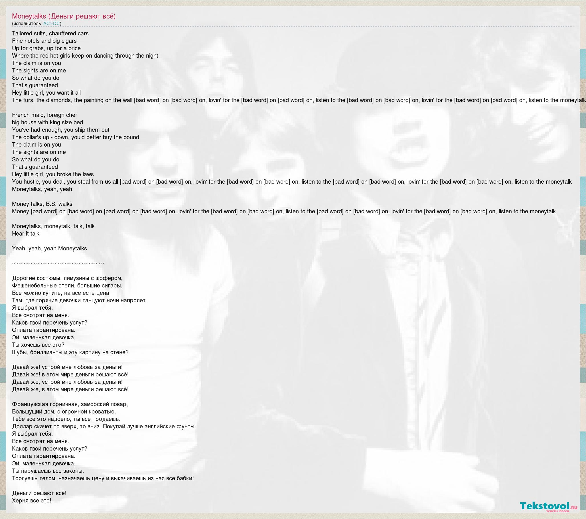 Tailored suits, chauffered cars Fine hotels and big cigars Up for grabs, up for a price Where the red hot girls keep on dancing through the night The claim is on you The sights are on me So what do you do That's guaranteed Hey little girl, you want it all The furs, the diamonds, the painting on the wall Come on, come on, lovin' for the money Come on, come on, listen to the moneytalk Come on, come on, lovin' for the money Come on, come on, listen to the moneytalk French maid, foreign chef big house with king size bed You've had enough, you ship them out The dollar's up - down, you'd better buy the pound The claim is on you The sights are on me So what do you do That's guaranteed Hey little girl, you broke the laws You hustle, you deal, you steal from us all Come on, come on, lovin' for the money Come on, come on, listen to the moneytalk Come on, come on, lovin' for the money Come on, come on, listen to the moneytalk Moneytalks, yeah, yeah Money talks, B.S. walks Money talks, come on, come on Come on, come on, lovin' for the money Come on, come on, listen to the moneytalk Come on, come on, lovin' for the money Come on, come on, listen to the moneytalk Moneytalks, moneytalk, talk, talk Hear it talk Yeah, yeah, yeah Moneytalks ~~~~~~~~~~~~~~~~~~~~~~~~~~~ Дорогие костюмы, лимузины с шофером, Фешенебельные отели, большие сигары, Все можно купить, на все есть цена Там, где горячие девочки танцуют ночи напролет. Я выбрал тебя, Все смотрят на меня. Каков твой перечень услуг? Оплата гарантирована. Эй, маленькая девочка, Ты хочешь все это? Шубы, бриллианты и эту картину на стене? Давай же! устрой мне любовь за деньги! Давай же! в этом мире деньги решают всё! Давай же, устрой мне любовь за деньги! Давай же, в этом мире деньги решают всё! Французская горничная, заморский повар, Большущий дом, с огромной кроватью. Тебе все это надоело, ты все продаешь. Доллар скачет то вверх, то вниз. Покупай лучше английские фунты. Я выбрал тебя, Все смотрят на меня. Каков твой перечень услуг? Оплата гарантирована. Эй, маленькая девочка, Ты нарушаешь все законы. Торгуешь телом, назначаешь цену и выкачиваешь из нас все бабки! Деньги решают всё! Херня все это!