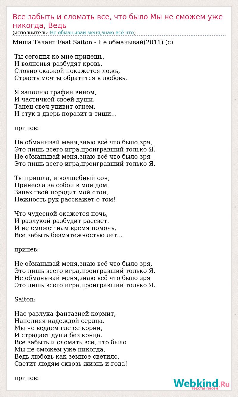 Главная→Исполнители→Не обманывай меня,знаю всё что→Все забыть и сломать все, что было Мы не сможем уже никогда, Ведь