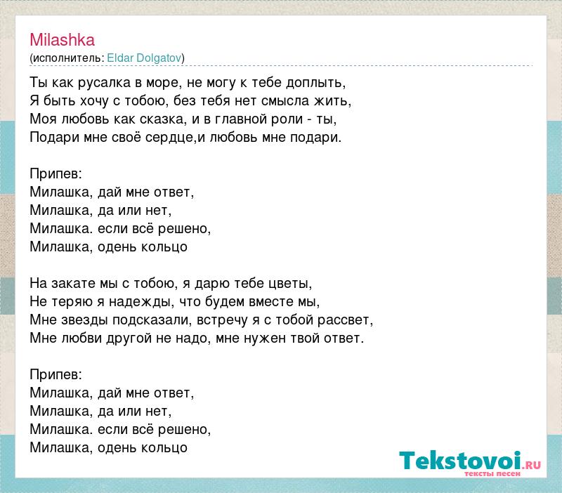 Ты как русалка в море, не могу к тебе доплыть, Я быть хочу с тобою, без тебя нет смысла жить, Моя любовь как сказка, и в главной роли - ты, Подари мне своё сердце,и любовь мне подари. Припев: Милашка, дай мне ответ, Милашка, да или нет, Милашка. если всё решено, Милашка, одень кольцо На закате мы с тобою, я дарю тебе цветы, Не теряю я надежды, что будем вместе мы, Мне звезды подсказали, встречу я с тобой рассвет, Мне любви другой не надо, мне нужен твой ответ. Припев: Милашка, дай мне ответ, Милашка, да или нет, Милашка. если всё решено, Милашка, одень кольцо