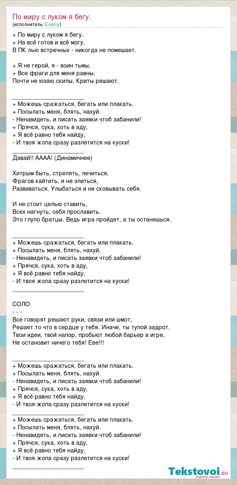 + По миру с луком я бегу. + На всё готов и всё могу. В ПК лью встречных - никогда не помешает. + Я не герой, я - воин тьмы, + Все фраги для меня равны. Почти не юзаю скилы. Криты решают. ______________________ + Можешь сражаться, бегать или плакать. + Посылать меня, блять, нахуй. - Ненавидеть, и писать заявки чтоб забанили! + Прячся, сука, хоть в аду, + Я всё равно тебя найду, - И твоя жопа сразу разлетится на куски! ______________________ Давай!! АААА! (Динамичнее) Хитрым быть, стрелять, лечиться, Фрагов кайтить, и не злиться, Развиваться. Улыбаться и не сковывать себя. И не стоит целью ставить, Всех нагнуть, себя прославить. Это глупо братцы. Ведь игра пройдет, а ты останешься. ______________________ + Можешь сражаться, бегать или плакать. + Посылать меня, блять, нахуй. - Ненавидеть, и писать заявки чтоб забанили! + Прячся, сука, хоть в аду, + Я всё равно тебя найду, - И твоя жопа сразу разлетится на куски! ______________________ СОЛО - - - Все говорят решают руки, связи или шмот, Решает то что в сердце у тебя. Иначе, ты тупой задрот. Твои идеи, твой напор, пробьют любой барьер в игре, Не остановит ничего тебя! Еее!!! ______________________ + Можешь сражаться, бегать или плакать. + Посылать меня, блять, нахуй. - Ненавидеть, и писать заявки чтоб забанили! + Прячся, сука, хоть в аду, + Я всё равно тебя найду, - И твоя жопа сразу разлетится на куски! ______________________ + Можешь сражаться, бегать или плакать. + Посылать меня, блять, нахуй. - Ненавидеть, и писать заявки чтоб забанили! + Прячся, сука, хоть в аду, + Я всё равно тебя найду, - И твоя жопа сразу разлетится на куски! ______________________