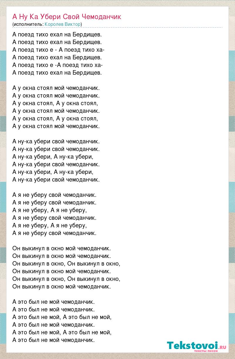А поезд тихо ехал на Бердищев. А поезд тихо ехал на Бердищев. А поезд тихо е - А поезд тихо ха- А поезд тихо ехал на Бердищев. А поезд тихо е -А поезд тихо ха- А поезд тихо ехал на Бердищев. А у окна стоял мой чемоданчик. А у окна стоял мой чемоданчик. А у окна стоял, А у окна стоял, А у окна стоял мой чемоданчик. А у окна стоял, А у окна стоял, А у окна стоял мой чемоданчик. А ну-ка убери свой чемоданчик. А ну-ка убери свой чемоданчик. А ну-ка убери, А ну-ка убери, А ну-ка убери свой чемоданчик. А ну-ка убери, А ну-ка убери, А ну-ка убери свой чемоданчик. А я не уберу свой чемоданчик. А я не уберу свой чемоданчик. А я не уберу, А я не уберу, А я не уберу свой чемоданчик. А я не уберу, А я не уберу, А я не уберу свой чемоданчик. Он выкинул в окно мой чемоданчик. Он выкинул в окно мой чемоданчик. Он выкинул в окно, Он выкинул в окно, Он выкинул в окно мой чемоданчик. Он выкинул в окно, Он выкинул в окно, Он выкинул в окно мой чемоданчик. А это был не мой чемоданчик. А это был не мой чемоданчик. А это был не мой, А это был не мой, А это был не мой чемоданчик. А это был не мой, А это был не мой, А это был не мой чемоданчик.
