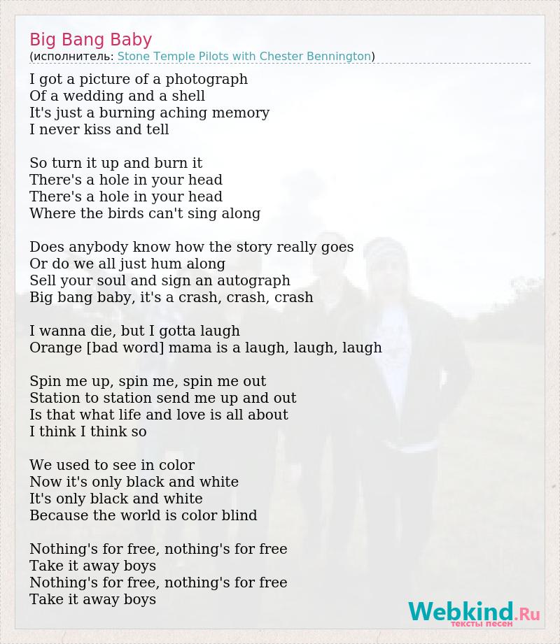 I got a picture of a photograph Of a wedding and a shell It's just a burning aching memory I never kiss and tell So turn it up and burn it There's a hole in your head There's a hole in your head Where the birds can't sing along Does anybody know how the story really goes Or do we all just hum along Sell your soul and sign an autograph Big bang baby, it's a crash, crash, crash I wanna die, but I gotta laugh Orange [bad word] mama is a laugh, laugh, laugh Spin me up, spin me, spin me out Station to station send me up and out Is that what life and love is all about I think I think so We used to see in color Now it's only black and white It's only black and white Because the world is color blind Nothing's for free, nothing's for free Take it away boys Nothing's for free, nothing's for free Take it away boys
