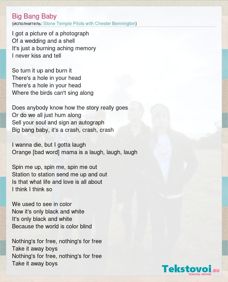 I got a picture of a photograph Of a wedding and a shell It's just a burning aching memory I never kiss and tell So turn it up and burn it There's a hole in your head There's a hole in your head Where the birds can't sing along Does anybody know how the story really goes Or do we all just hum along Sell your soul and sign an autograph Big bang baby, it's a crash, crash, crash I wanna die, but I gotta laugh Orange [bad word] mama is a laugh, laugh, laugh Spin me up, spin me, spin me out Station to station send me up and out Is that what life and love is all about I think I think so We used to see in color Now it's only black and white It's only black and white Because the world is color blind Nothing's for free, nothing's for free Take it away boys Nothing's for free, nothing's for free Take it away boys