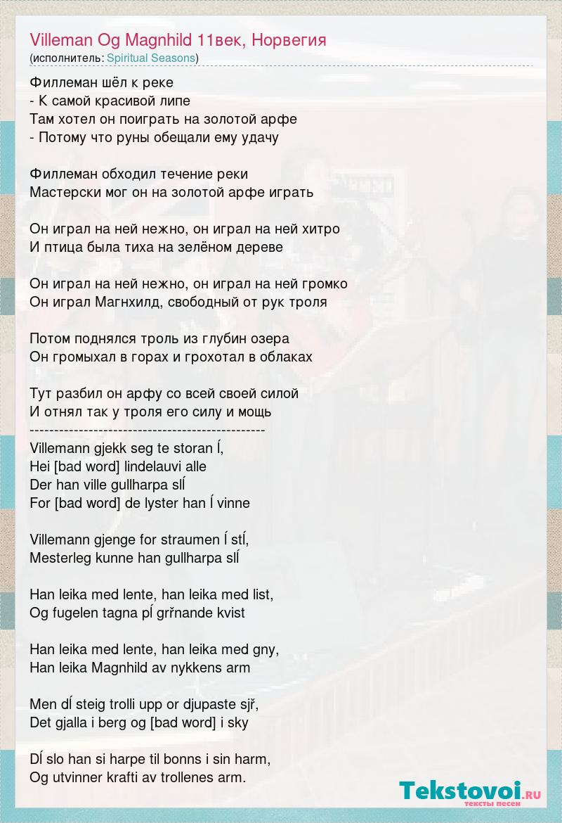 Филлеман шёл к реке - К самой красивой липе Там хотел он поиграть на золотой арфе - Потому что руны обещали ему удачу Филлеман обходил течение реки Мастерски мог он на золотой арфе играть Он играл на ней нежно, он играл на ней хитро И птица была тиха на зелёном дереве Он играл на ней нежно, он играл на ней громко Он играл Магнхилд, свободный от рук троля Потом поднялся троль из глубин озера Он громыхал в горах и грохотал в облаках Тут разбил он арфу со всей своей силой И отнял так у троля его силу и мощь ------------------------------------------------ Villemann gjekk seg te storan ĺ, Hei [bad word] lindelauvi alle Der han ville gullharpa slĺ For de runerne de lyster han ĺ vinne Villemann gjenge for straumen ĺ stĺ, Mesterleg kunne han gullharpa slĺ Han leika med lente, han leika med list, Og fugelen tagna pĺ grřnande kvist Han leika med lente, han leika med gny, Han leika Magnhild av nykkens arm Men dĺ steig trolli upp or djupaste sjř, Det gjalla i berg og det runga i sky Dĺ slo han si harpe til bonns i sin harm, Og utvinner krafti av trollenes arm.