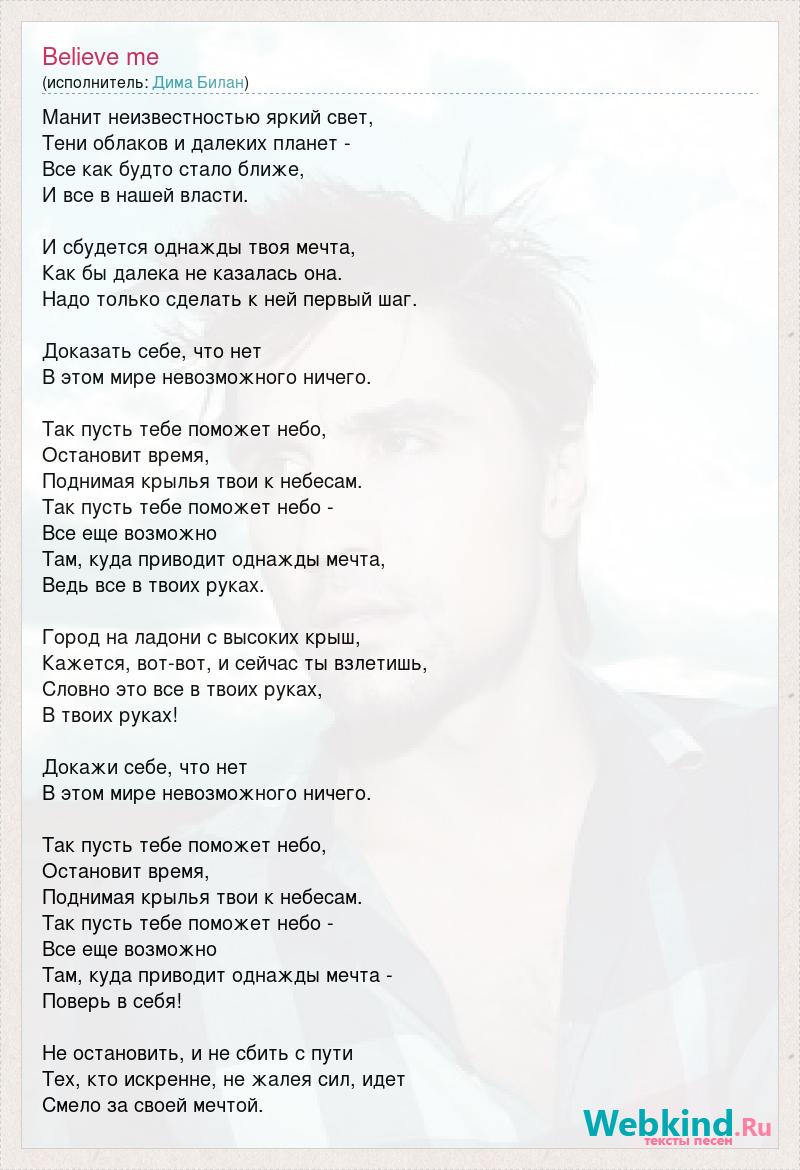 Манит неизвестностью яркий свет, Тени облаков и далеких планет - Все как будто стало ближе, И все в нашей власти. И сбудется однажды твоя мечта, Как бы далека не казалась она. Надо только сделать к ней первый шаг. Доказать себе, что нет В этом мире невозможного ничего. Так пусть тебе поможет небо, Остановит время, Поднимая крылья твои к небесам. Так пусть тебе поможет небо - Все еще возможно Там, куда приводит однажды мечта, Ведь все в твоих руках. Город на ладони с высоких крыш, Кажется, вот-вот, и сейчас ты взлетишь, Словно это все в твоих руках, В твоих руках! Докажи себе, что нет В этом мире невозможного ничего. Так пусть тебе поможет небо, Остановит время, Поднимая крылья твои к небесам. Так пусть тебе поможет небо - Все еще возможно Там, куда приводит однажды мечта - Поверь в себя! Не остановить, и не сбить с пути Тех, кто искренне, не жалея сил, идет Смело за своей мечтой.