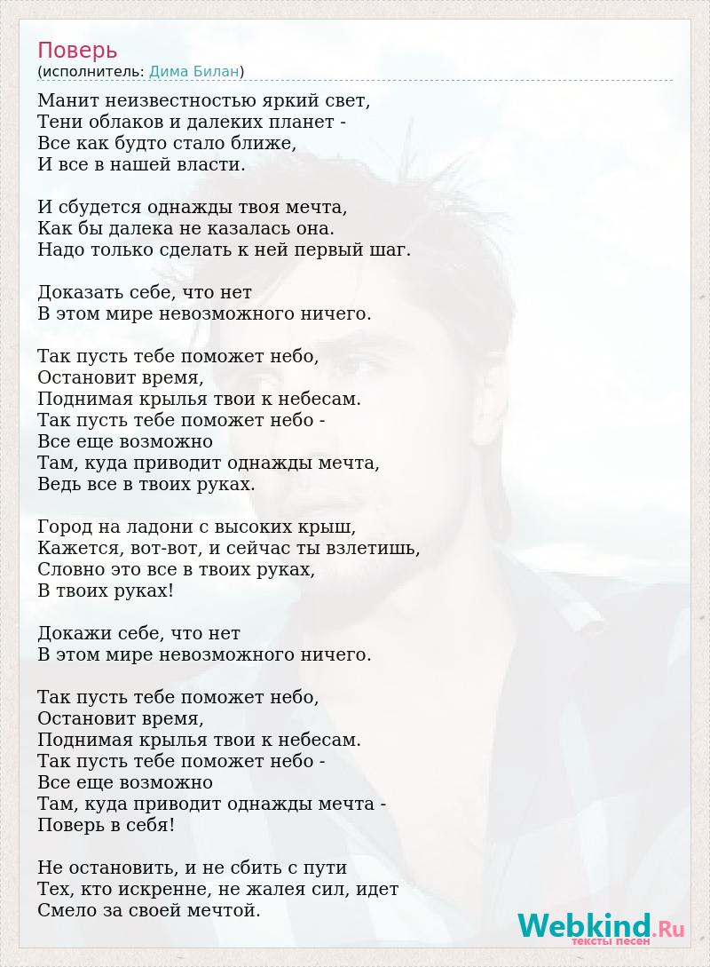 Манит неизвестностью яркий свет, Тени облаков и далеких планет - Все как будто стало ближе, И все в нашей власти. И сбудется однажды твоя мечта, Как бы далека не казалась она. Надо только сделать к ней первый шаг. Доказать себе, что нет В этом мире невозможного ничего. Так пусть тебе поможет небо, Остановит время, Поднимая крылья твои к небесам. Так пусть тебе поможет небо - Все еще возможно Там, куда приводит однажды мечта, Ведь все в твоих руках. Город на ладони с высоких крыш, Кажется, вот-вот, и сейчас ты взлетишь, Словно это все в твоих руках, В твоих руках! Докажи себе, что нет В этом мире невозможного ничего. Так пусть тебе поможет небо, Остановит время, Поднимая крылья твои к небесам. Так пусть тебе поможет небо - Все еще возможно Там, куда приводит однажды мечта - Поверь в себя! Не остановить, и не сбить с пути Тех, кто искренне, не жалея сил, идет Смело за своей мечтой.