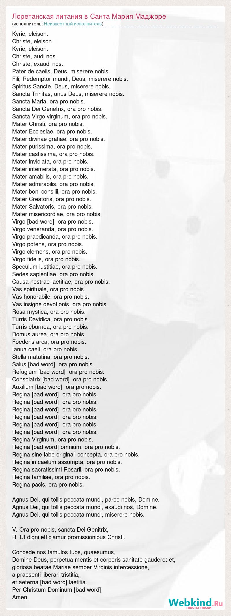 Kyrie, eleison. Christe, eleison. Kyrie, eleison. Christe, audi nos. Christe, exaudi nos. Pater de caelis, Deus, miserere nobis. Fili, Redemptor mundi, Deus, miserere nobis. Spiritus Sancte, Deus, miserere nobis. Sancta Trinitas, unus Deus, miserere nobis. Sancta Maria, ora pro nobis. Sancta Dei Genetrix, ora pro nobis. Sancta Virgo virginum, ora pro nobis. Mater Christi, ora pro nobis. Mater Ecclesiae, ora pro nobis. Mater divinae gratiae, ora pro nobis. Mater purissima, ora pro nobis. Mater castissima, ora pro nobis. Mater inviolata, ora pro nobis. Mater intemerata, ora pro nobis. Mater amabilis, ora pro nobis. Mater admirabilis, ora pro nobis. Mater boni consilii, ora pro nobis. Mater Creatoris, ora pro nobis. Mater Salvatoris, ora pro nobis. Mater misericordiae, ora pro nobis. Virgo [bad word] ora pro nobis. Virgo veneranda, ora pro nobis. Virgo praedicanda, ora pro nobis. Virgo potens, ora pro nobis. Virgo clemens, ora pro nobis. Virgo fidelis, ora pro nobis. Speculum iustitiae, ora pro nobis. Sedes sapientiae, ora pro nobis. Causa nostrae laetitiae, ora pro nobis. Vas spirituale, ora pro nobis. Vas honorabile, ora pro nobis. Vas insigne devotionis, ora pro nobis. Rosa mystica, ora pro nobis. Turris Davidica, ora pro nobis. Turris eburnea, ora pro nobis. Domus aurea, ora pro nobis. Foederis arca, ora pro nobis. Ianua caeli, ora pro nobis. Stella matutina, ora pro nobis. Salus [bad word] ora pro nobis. Refugium [bad word] ora pro nobis. Consolatrix [bad word] ora pro nobis. Auxilium [bad word] ora pro nobis. Regina [bad word] ora pro nobis. Regina [bad word] ora pro nobis. Regina [bad word] ora pro nobis. Regina [bad word] ora pro nobis. Regina [bad word] ora pro nobis. Regina [bad word] ora pro nobis. Regina Virginum, ora pro nobis. Regina [bad word] omnium, ora pro nobis. Regina sine labe originali concepta, ora pro nobis. Regina in caelum assumpta, ora pro nobis. Regina sacratissimi Rosarii, ora pro nobis. Regina familiae, ora pro nobis. Regina pacis, ora pro nobis. Agnus Dei, qui tollis peccata mundi, parce nobis, Domine. Agnus Dei, qui tollis peccata mundi, exaudi nos, Domine. Agnus Dei, qui tollis peccata mundi, miserere nobis. V. Ora pro nobis, sancta Dei Genitrix, R. Ut digni efficiamur promissionibus Christi. Concede nos famulos tuos, quaesumus, Domine Deus, perpetua mentis et corporis sanitate gaudere: et, gloriosa beatae Mariae semper Virginis intercessione, a praesenti liberari tristitia, et aeterna [bad word] laetitia. Per Christum Dominum [bad word] Amen.