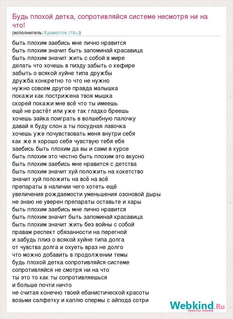 быть плохим заебись мне лично нравится быть плохим значит быть запоминай красавица быть плохим значит жить с собой в мире делать что хочешь в пизду забыть о кефире забыть о всякой хуйне типа дружбы дружба конкретно то что не нужно нужно совсем другое правда малышка покажи как пострижена твоя мышка скорей покажи мне всё что ты имеешь ещё не растёт или уже так гладко бреешь хочешь зайка поиграть в волшебную палочку давай я буду слон а ты посудная лавочка хочешь уже почувствовать меня внутри себя как же я хорошо себя чувствую тебя ебя заебись быть плохим да вы и сами в курсе быть плохим это честно быть плохим это вкусно быть плохим заебись мне нравится с детства быть плохим значит хуй положить на кокетство значит хуй положить на всё на всё препараты в наличии чего хотеть ещё увеличения рождаемости уменьшения озоновой дыры не знаю не уверен препараты оставьте и хары быть плохим заебись мне лично нравится быть плохим значит быть запоминай красавица быть плохим значит жить без войны с собой правам респект обязанности на перегной и забудь плиз о всякой хуйне типа долга от чувства долга и охуеть враз не долго что можно добавить в продолжении темы будь плохой детка сопротивляйся системе сопротивляйся не смотря ни на что ты это то как ты сопротивляешься и больше почти ничто не считая конечно твоей ебанистической красоты возьми салфетку и каплю спермы с айпода сотри