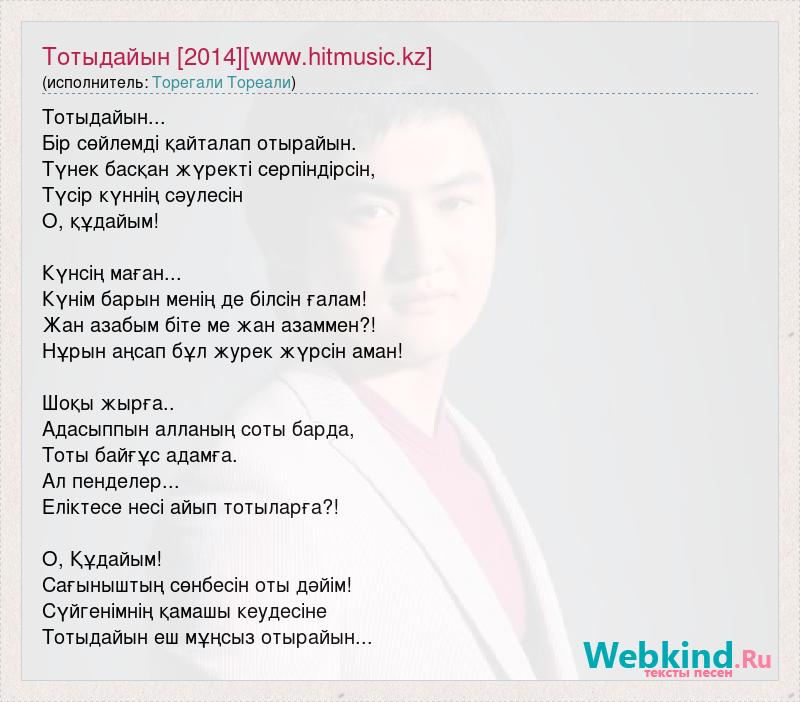 Тотыдайын... Бір сөйлемді қайталап отырайын. Түнек басқан жүректі серпіндірсін, Түсір күннің сәулесін О, құдайым! Күнсің маған... Күнім барын менің де білсін ғалам! Жан азабым біте ме жан азаммен?! Нұрын аңсап бұл журек жүрсін аман! Шоқы жырға.. Адасыппын алланың соты барда, Тоты байғұс адамға. Ал пенделер... Еліктесе несі айып тотыларға?! О, Құдайым! Сағыныштың сөнбесін оты дәйім! Сүйгенімнің қамашы кеудесіне Тотыдайын еш мұңсыз отырайын...