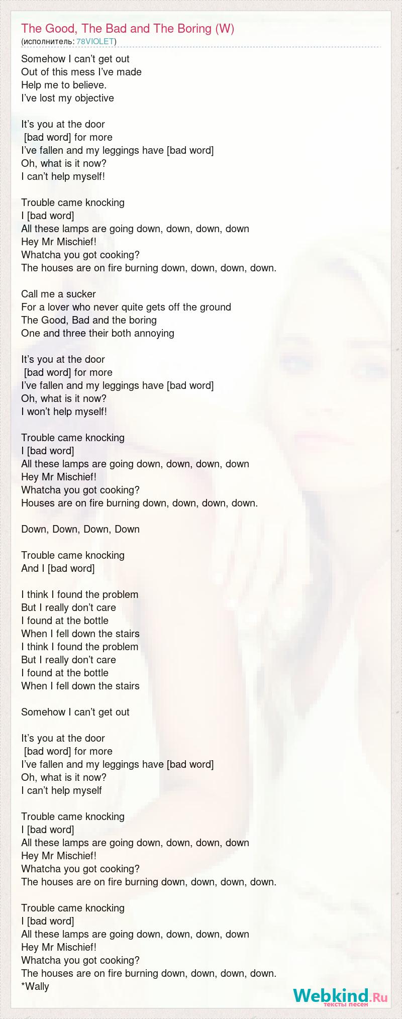 Somehow I can’t get out Out of this mess I’ve made Help me to believe. I’ve lost my objective It’s you at the door [bad word] for more I’ve fallen and my leggings have [bad word] Oh, what is it now? I can’t help myself! Trouble came knocking I [bad word] All these lamps are going down, down, down, down Hey Mr Mischief! Whatcha you got cooking? The houses are on fire burning down, down, down, down. Call me a sucker For a lover who never quite gets off the ground The Good, Bad and the boring One and three their both annoying It’s you at the door [bad word] for more I’ve fallen and my leggings have [bad word] Oh, what is it now? I won’t help myself! Trouble came knocking I [bad word] All these lamps are going down, down, down, down Hey Mr Mischief! Whatcha you got cooking? Houses are on fire burning down, down, down, down. Down, Down, Down, Down Trouble came knocking And I [bad word] I think I found the problem But I really don’t care I found at the bottle When I fell down the stairs I think I found the problem But I really don’t care I found at the bottle When I fell down the stairs Somehow I can’t get out It’s you at the door [bad word] for more I’ve fallen and my leggings have [bad word] Oh, what is it now? I can’t help myself Trouble came knocking I [bad word] All these lamps are going down, down, down, down Hey Mr Mischief! Whatcha you got cooking? The houses are on fire burning down, down, down, down. Trouble came knocking I [bad word] All these lamps are going down, down, down, down Hey Mr Mischief! Whatcha you got cooking? The houses are on fire burning down, down, down, down. *Wally