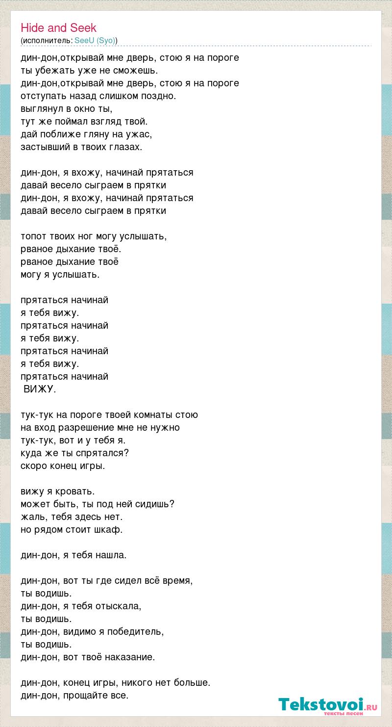 дин-дон,открывай мне дверь, стою я на пороге ты убежать уже не сможешь. дин-дон,открывай мне дверь, стою я на пороге отступать назад слишком поздно. выглянул в окно ты, тут же поймал взгляд твой. дай поближе гляну на ужас, застывший в твоих глазах. дин-дон, я вхожу, начинай прятаться давай весело сыграем в прятки дин-дон, я вхожу, начинай прятаться давай весело сыграем в прятки топот твоих ног могу услышать, рваное дыхание твоё. рваное дыхание твоё могу я услышать. прятаться начинай я тебя вижу. прятаться начинай я тебя вижу. прятаться начинай я тебя вижу. прятаться начинай ВИЖУ. тук-тук на пороге твоей комнаты стою на вход разрешение мне не нужно тук-тук, вот и у тебя я. куда же ты спрятался? скоро конец игры. вижу я кровать. может быть, ты под ней сидишь? жаль, тебя здесь нет. но рядом стоит шкаф. дин-дон, я тебя нашла. дин-дон, вот ты где сидел всё время, ты водишь. дин-дон, я тебя отыскала, ты водишь. дин-дон, видимо я победитель, ты водишь. дин-дон, вот твоё наказание. дин-дон, конец игры, никого нет больше. дин-дон, прощайте все.