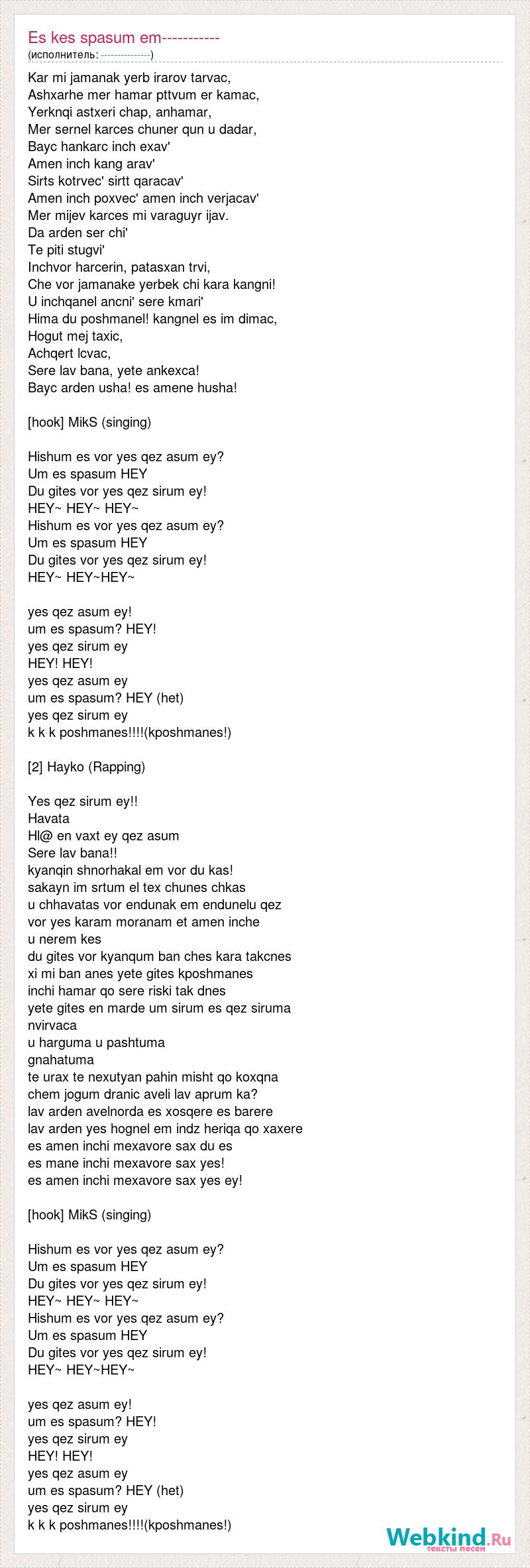 Kar mi jamanak yerb irarov tarvac, Ashxarhe mer hamar pttvum er kamac, Yerknqi astxeri chap, anhamar, Mer sernel karces chuner qun u dadar, Bayc hankarc inch exav' Amen inch kang arav' Sirts kotrvec' sirtt qaracav' Amen inch poxvec' amen inch verjacav' Mer mijev karces mi varaguyr ijav. Da arden ser chi' Te piti stugvi' Inchvor harcerin, patasxan trvi, Che vor jamanake yerbek chi kara kangni! U inchqanel ancni' sere kmari' Hima du poshmanel! kangnel es im dimac, Hogut mej taxic, Achqert lcvac, Sere lav bana, yete ankexca! Bayc arden usha! es amene husha! [hook] MikS (singing) Hishum es vor yes qez asum ey? Um es spasum HEY Du gites vor yes qez sirum ey! HEY~ HEY~ HEY~ Hishum es vor yes qez asum ey? Um es spasum HEY Du gites vor yes qez sirum ey! HEY~ HEY~HEY~ yes qez asum ey! um es spasum? HEY! yes qez sirum ey HEY! HEY! yes qez asum ey um es spasum? HEY (het) yes qez sirum ey k k k poshmanes!!!!(kposhmanes!) [2] Hayko (Rapping) Yes qez sirum ey!! Havata Hl@ en vaxt ey qez asum Sere lav bana!! kyanqin shnorhakal em vor du kas! sakayn im srtum el tex chunes chkas u chhavatas vor endunak em endunelu qez vor yes karam moranam et amen inche u nerem kes du gites vor kyanqum ban ches kara takcnes xi mi ban anes yete gites kposhmanes inchi hamar qo sere riski tak dnes yete gites en marde um sirum es qez siruma nvirvaca u harguma u pashtuma gnahatuma te urax te nexutyan pahin misht qo koxqna chem jogum dranic aveli lav aprum ka? lav arden avelnorda es xosqere es barere lav arden yes hognel em indz heriqa qo xaxere es amen inchi mexavore sax du es es mane inchi mexavore sax yes! es amen inchi mexavore sax yes ey! [hook] MikS (singing) Hishum es vor yes qez asum ey? Um es spasum HEY Du gites vor yes qez sirum ey! HEY~ HEY~ HEY~ Hishum es vor yes qez asum ey? Um es spasum HEY Du gites vor yes qez sirum ey! HEY~ HEY~HEY~ yes qez asum ey! um es spasum? HEY! yes qez sirum ey HEY! HEY! yes qez asum ey um es spasum? HEY (het) yes qez sirum ey k k k poshmanes!!!!(kposhmanes!)
